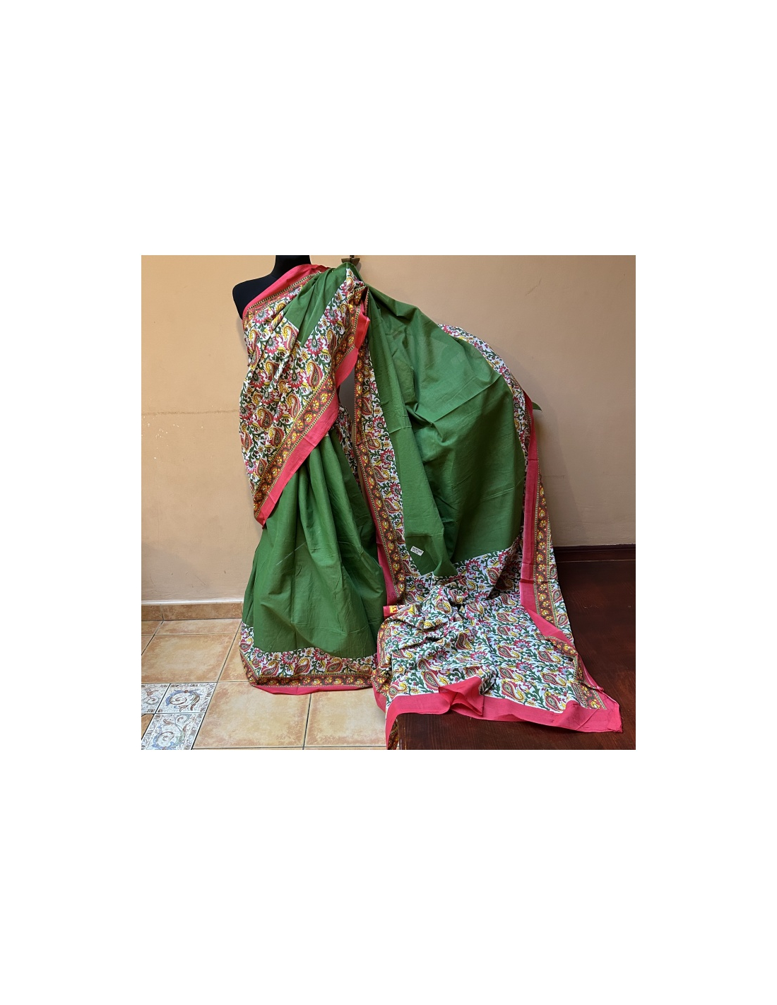 Bavlněné sárí s látkou na blúzku/čolí (na foto vpravo na zemi).