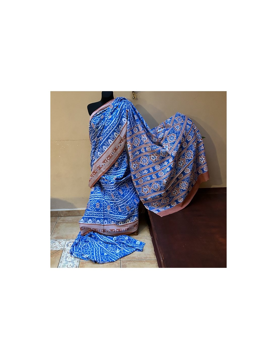 Bavlněné sárí, s látkou na blúzku/čolí (na foto vlevo na zemi). Ručně tištěná látka velmi starou a pracnou technikou tzv. Hand Block