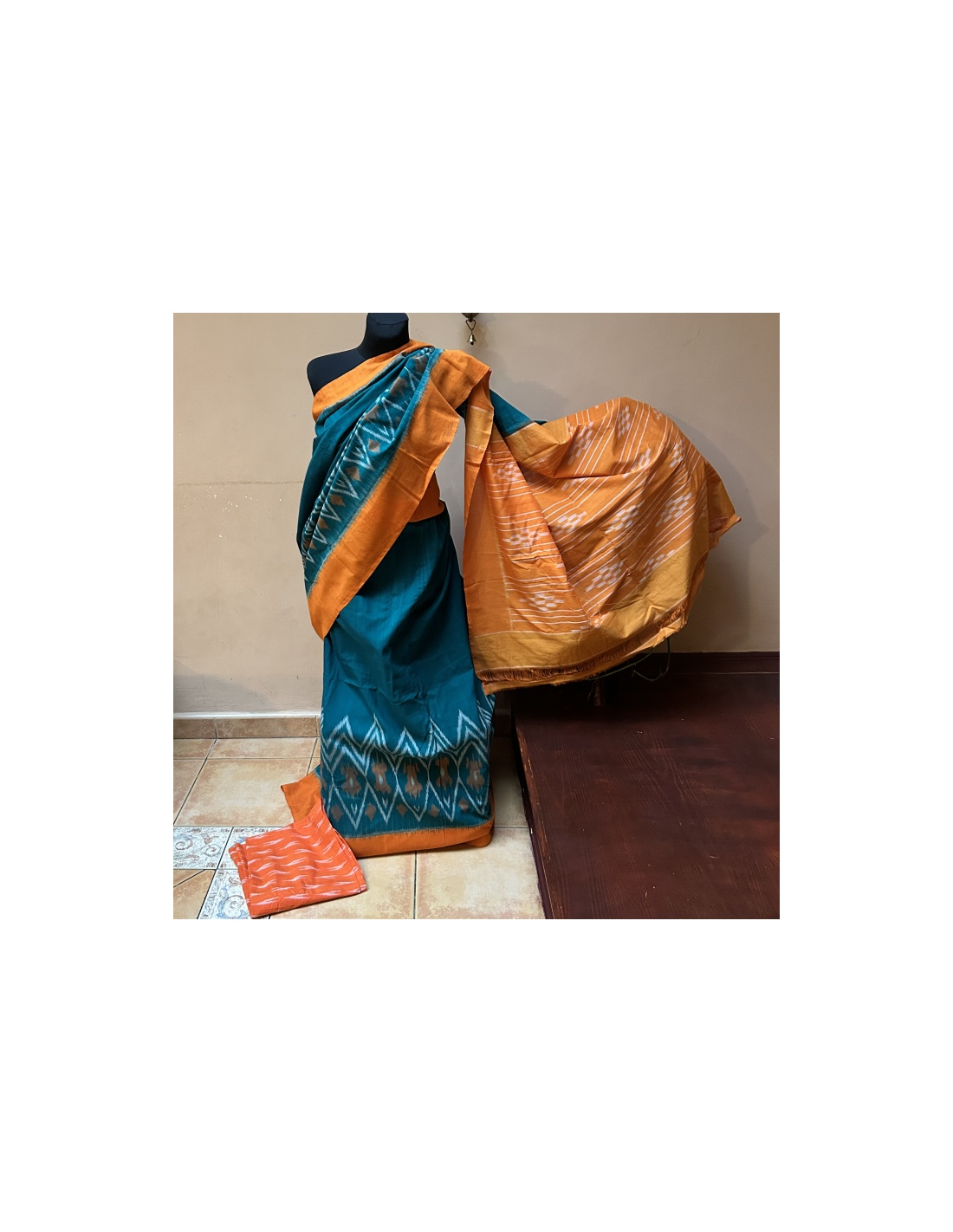 Sárí bavlna ruční tisk zelená-oranžová s látkou na čolí