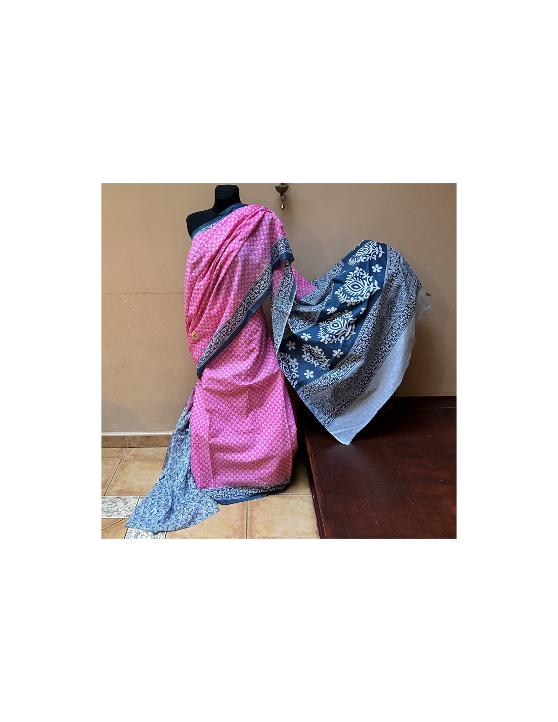 Bavlněné sárí s látkou na blúzku/čolí (na foto vlevo na zemi). Ručně tištěná látka velmi starou a pracnou technikou tzv. Hand Block.