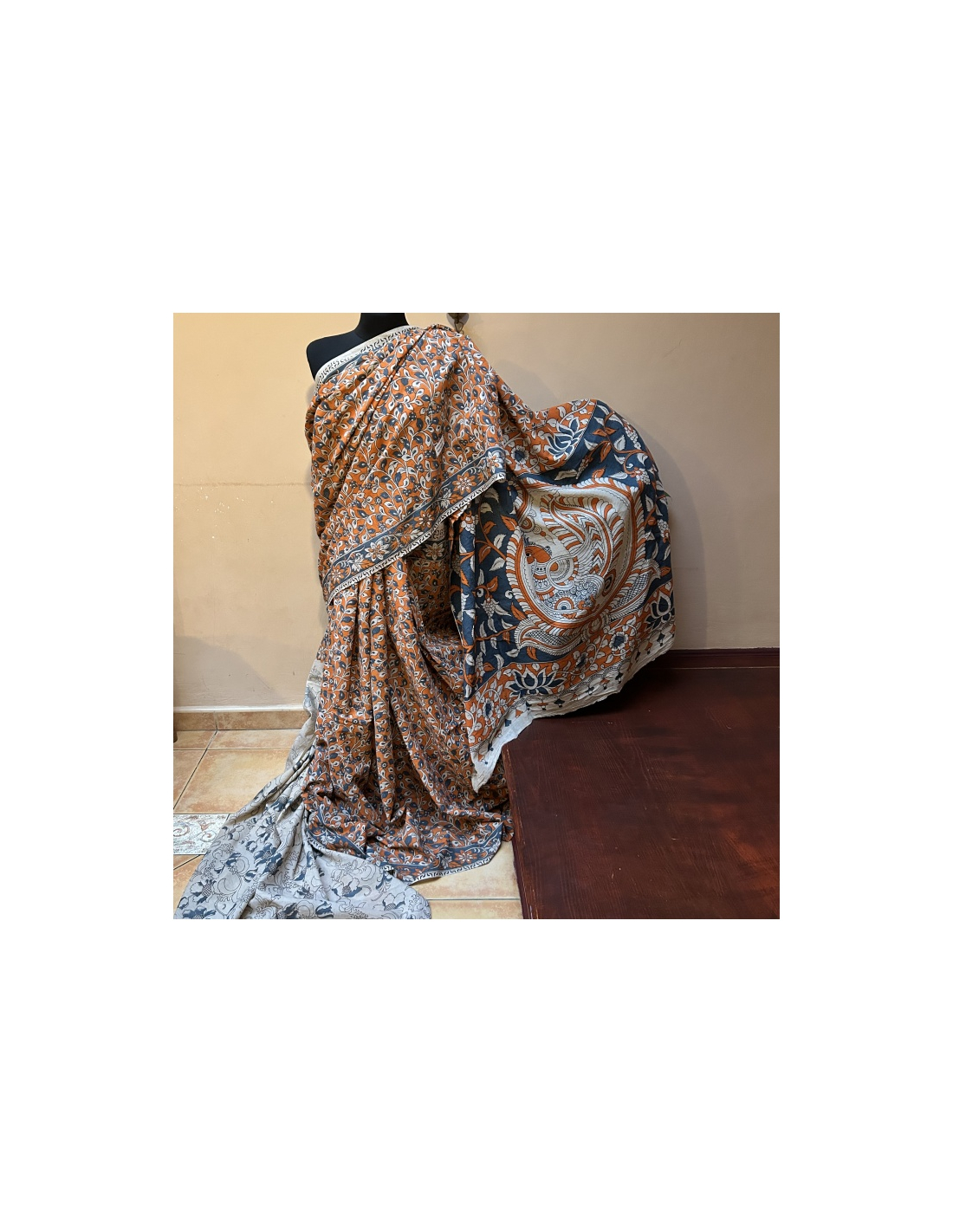 Bavlněné sárí tištěné technikou kalamakari s květinovým vzorem a s motivem páva na headpiece. Vhodné i pro vysokou ženu.