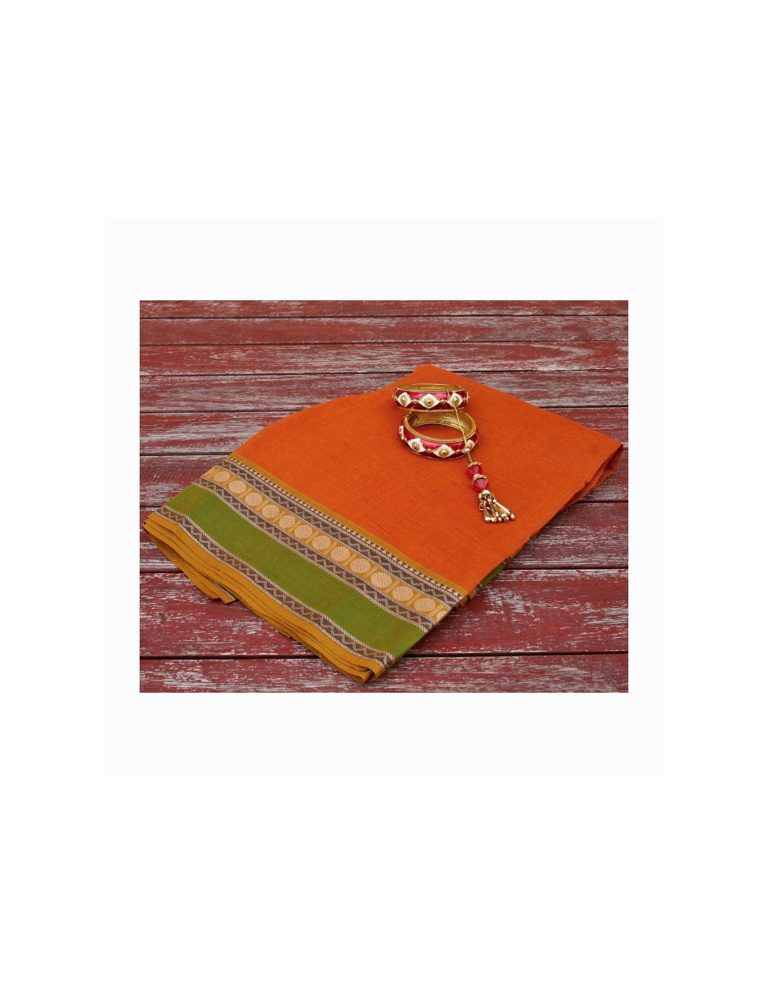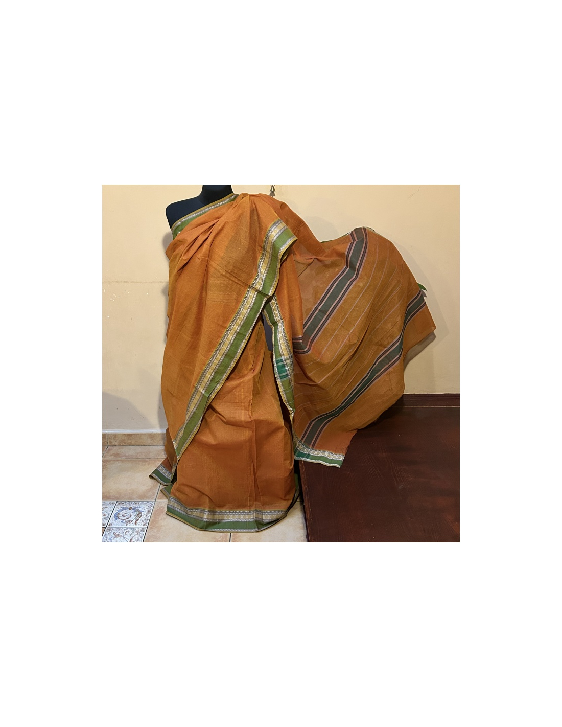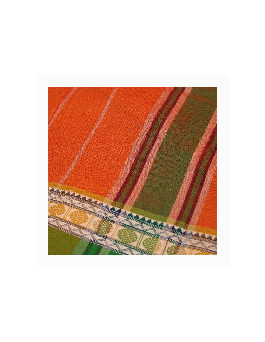 Bavlněné sárí s decentním vzorem z pruhů a uzších bordur. Vhodné i pro vyšší a silnější ženu.