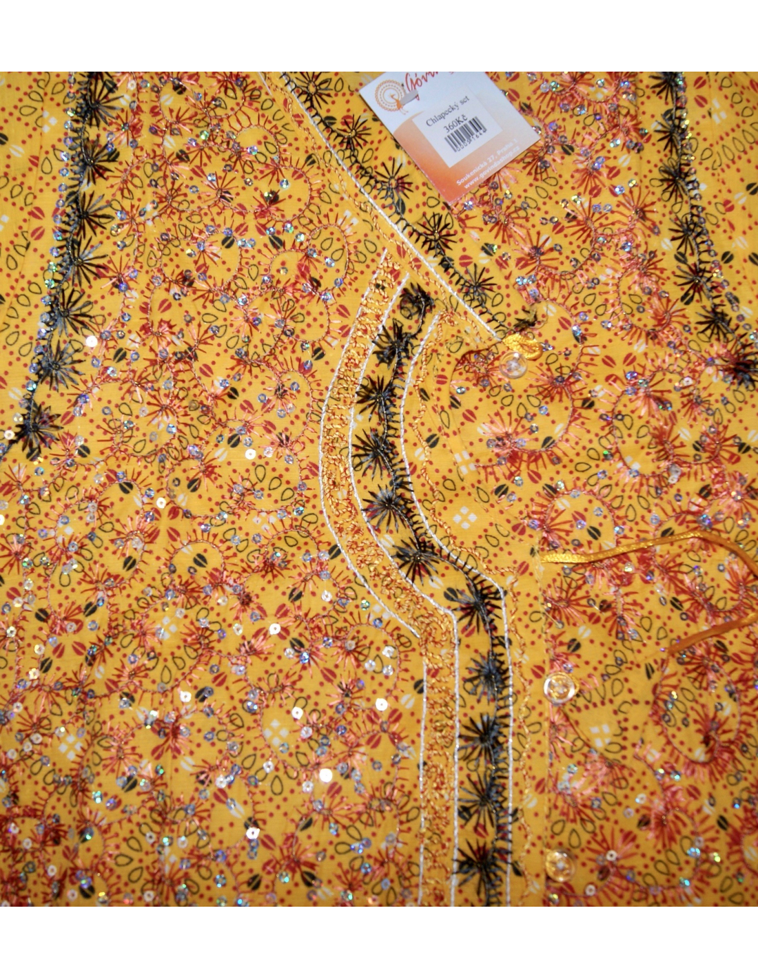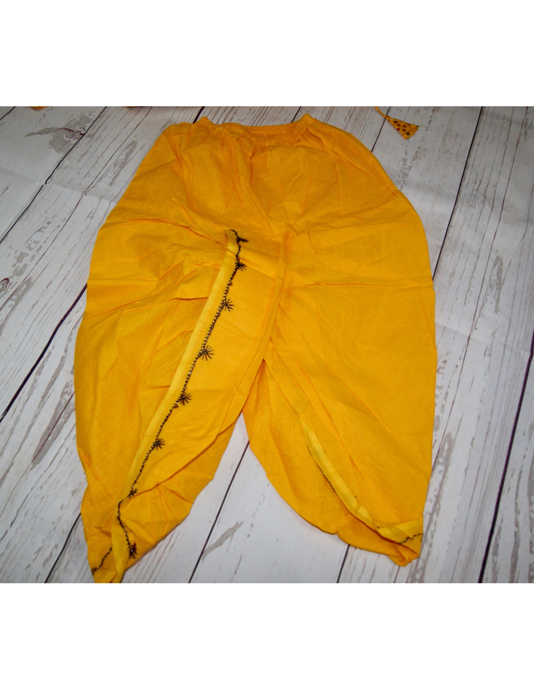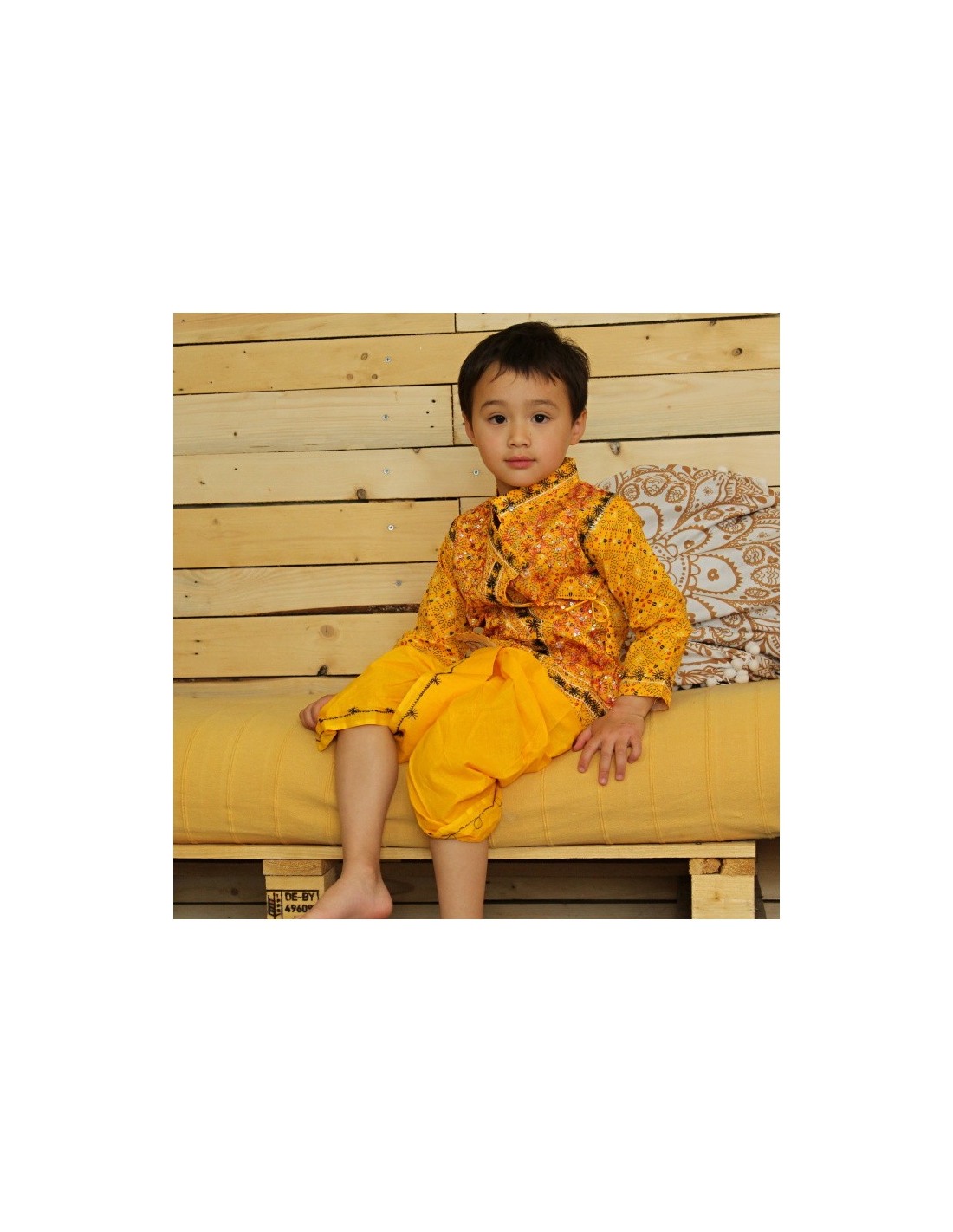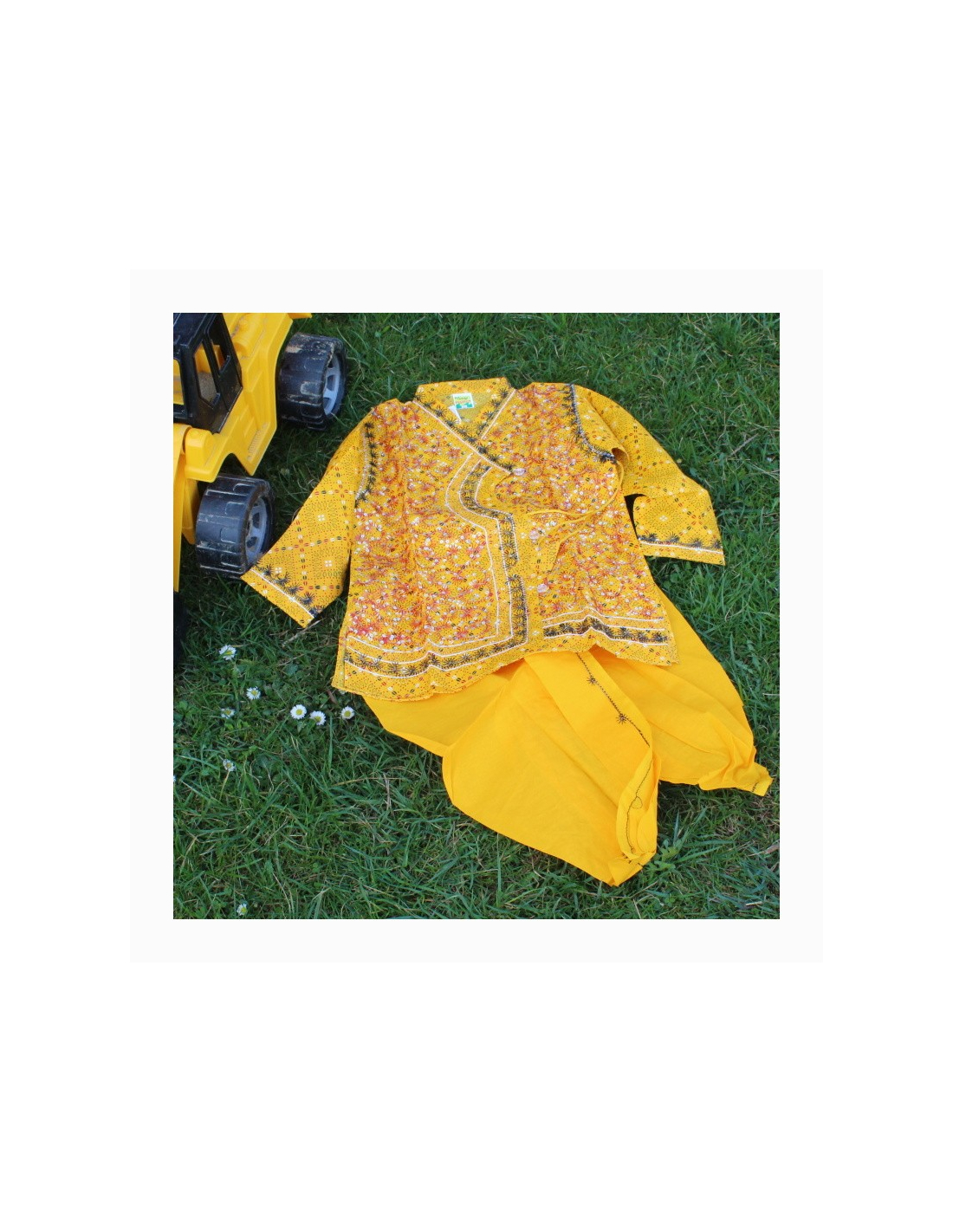 Krásný sluníčkový set pro chlapce. Kurta a dhótí, které se obleče jako kalhoty.Je na gumičku. Kurta zdobena flitry a výšivkami.
