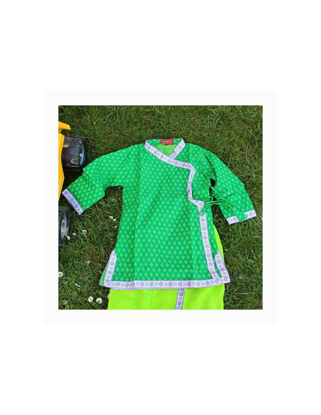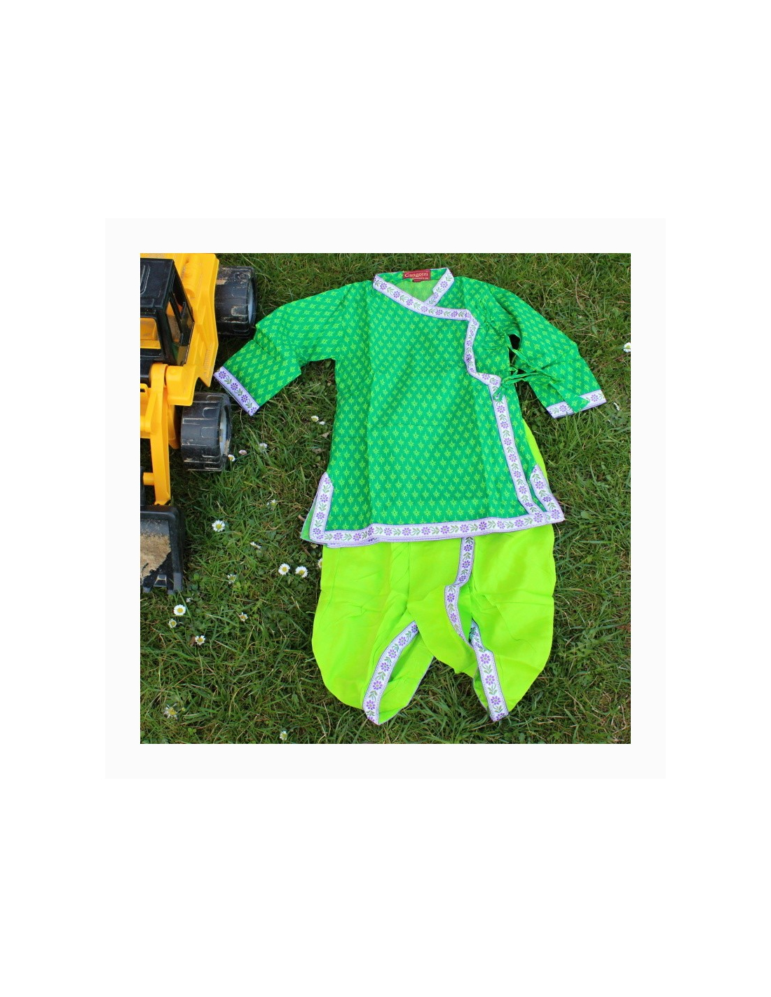 Krásný set pro chlapce. Kurta a dhótí, které se obleče jako kalhoty. Je na gumičku. Kurta je zavinovací, a proto lze v pase povolit nebo utáhnout.