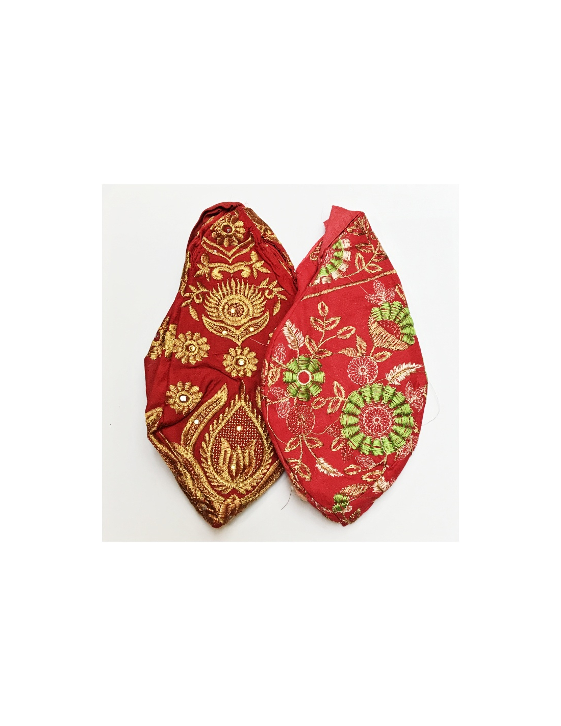 Bavlněný japa pytlík na růženec v červené barvě se zlatou výšivkou k výběru ve dvou vzorech (01 vlevo, 02 vpravo na obrázku).