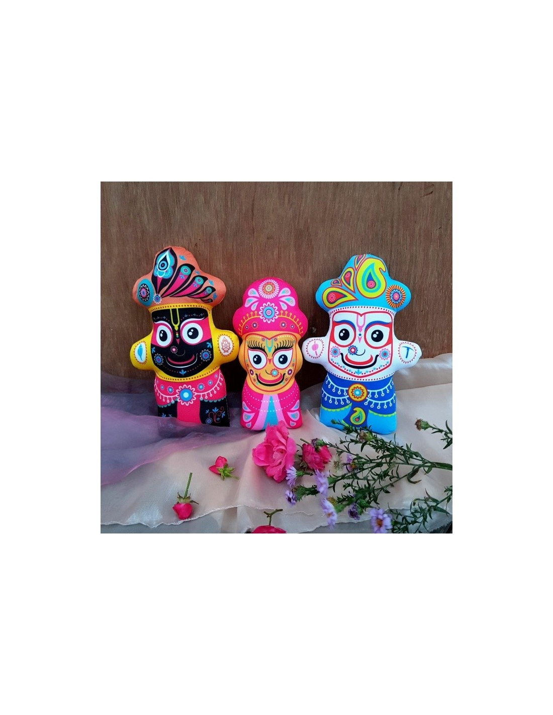 Textilní panenky Jagannáth, Baladév a Subhadra. 3 kusy. Výplň duté vlákno. Vhodné pro děti, nezávadné.