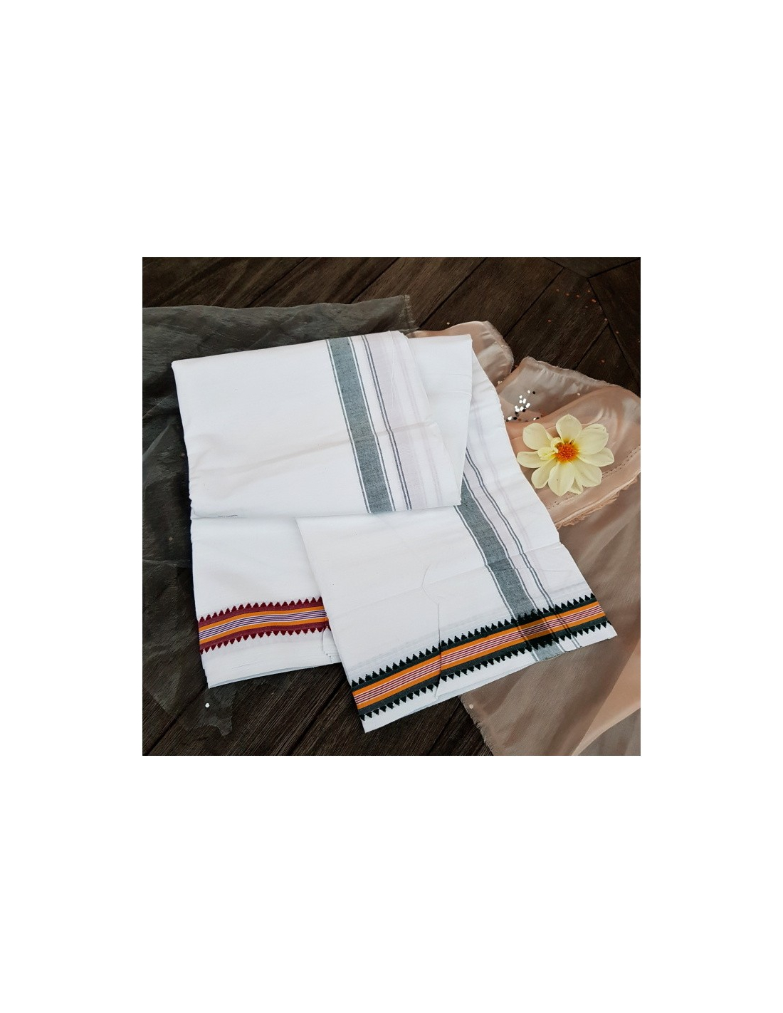 Bílé dhotí s pruhy bordové a zelené barvy, bordura s píky v bordó a zelené barvě.