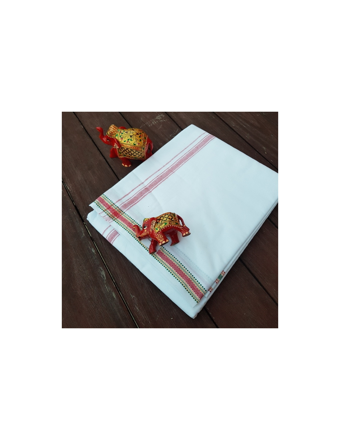 Bílé dhotí se čtyřmi proužky, bordura drobný vzor. K výběru dle barvy proužků červená, bordó nebo oranžová.