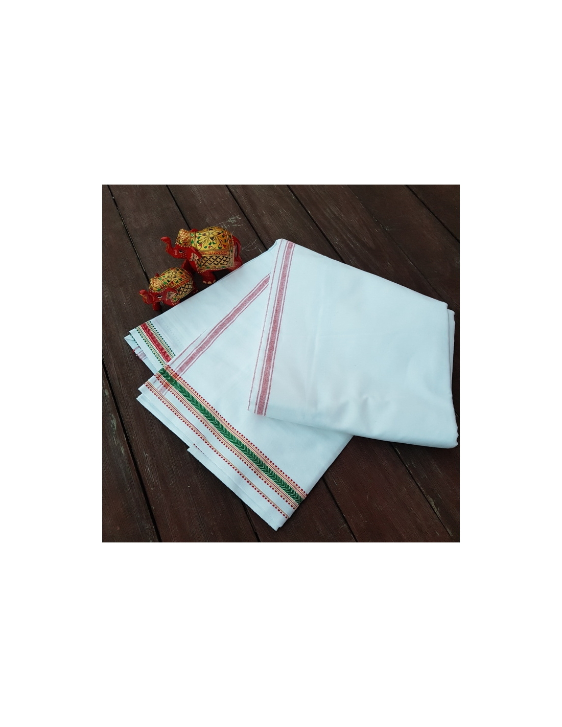 Bílé dhotí se čtyřmi proužky, bordura drobný vzor. K výběru dle barvy proužků červená, bordó nebo oranžová.