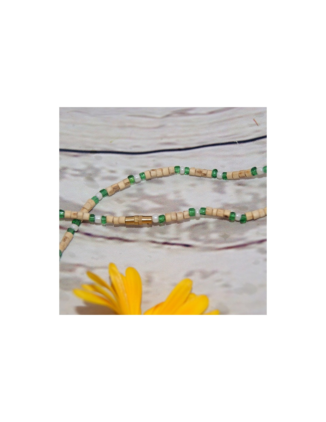 Dvouřadá kantimála se zelenými korálky a perlovými korálky vyrobená z posvátného keříku tulasí. Ochraňuje.
