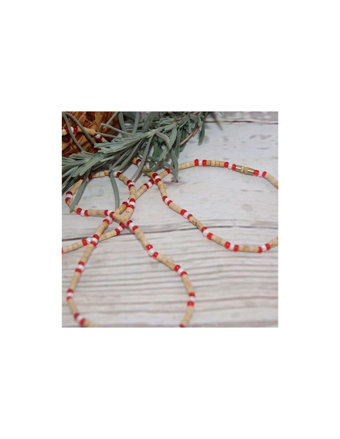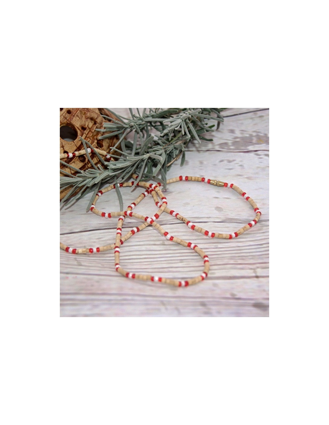 Dvouřadá kantimála s červenými korálky a perlami vyrobená z posvátného keříku tulasí. Ochraňuje.
