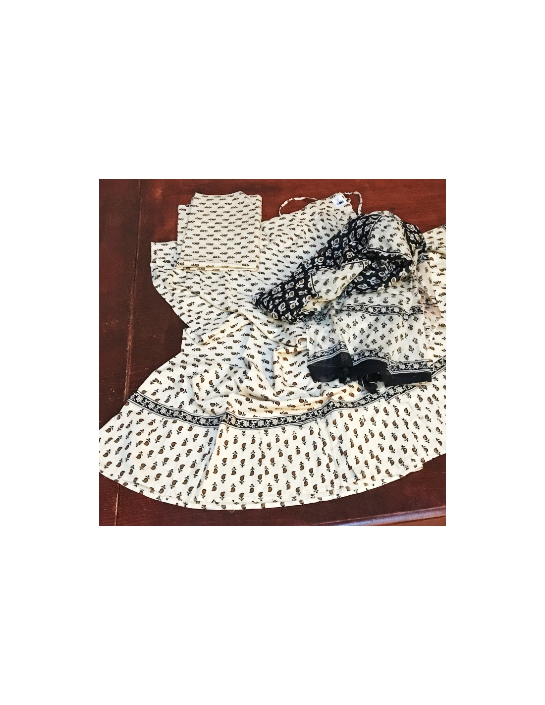 Gopi dress složený z dlouhé zvonové sukně, dupatty a látky na ušití čolí. Lze je nosit i odděleně a vytvářet si další zajímavé kombinace. Jemná měkká bavlna zajišťuje pohodlí a vzdušnost.