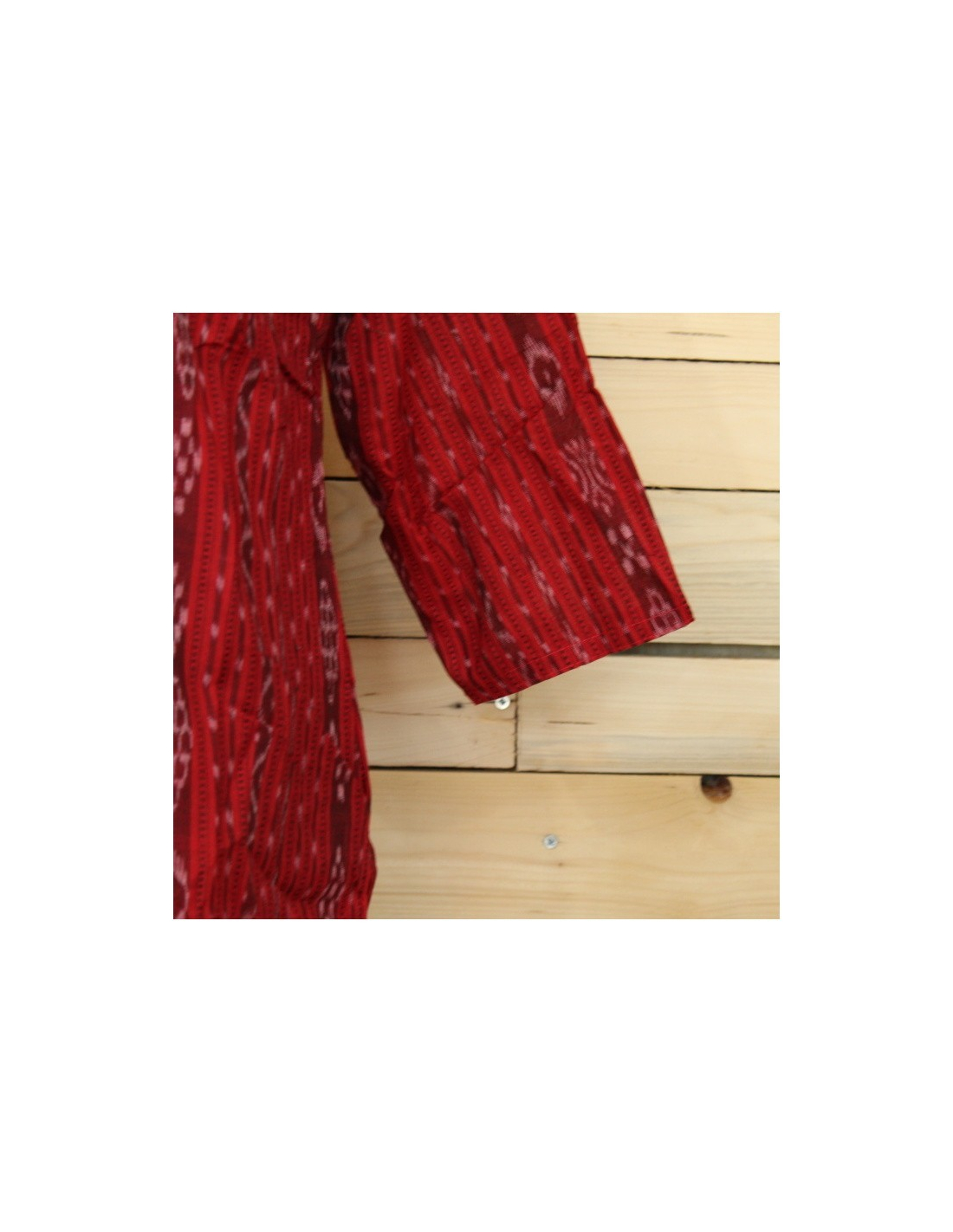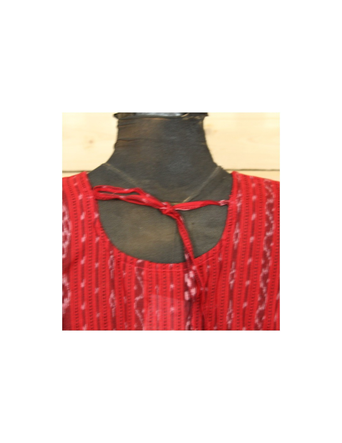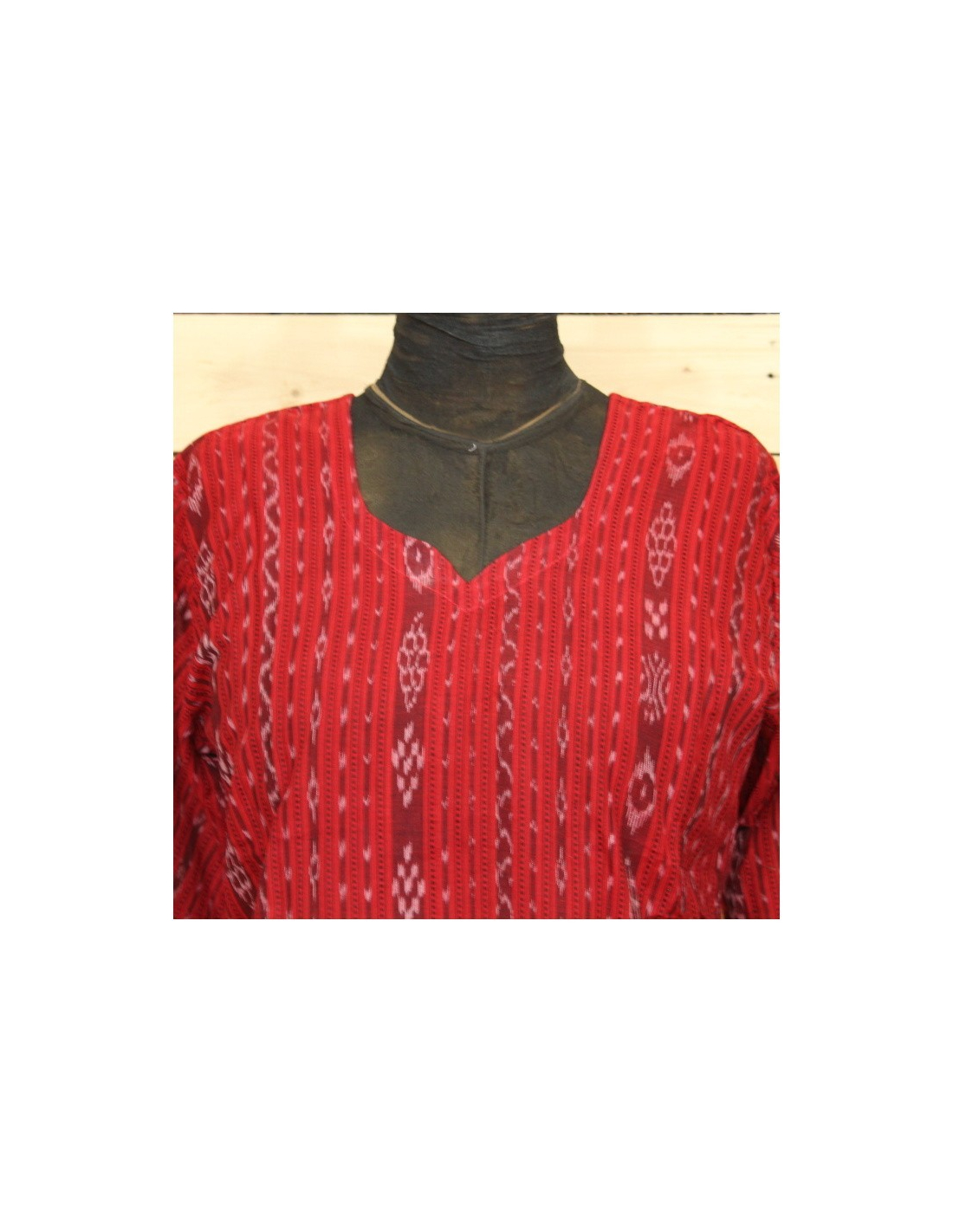 Dámská červená halenka se vzorem Orissa, třičtvrteční rukávy, mírně projmutý střih v pase. Výkroj na zádech se zavazováním.