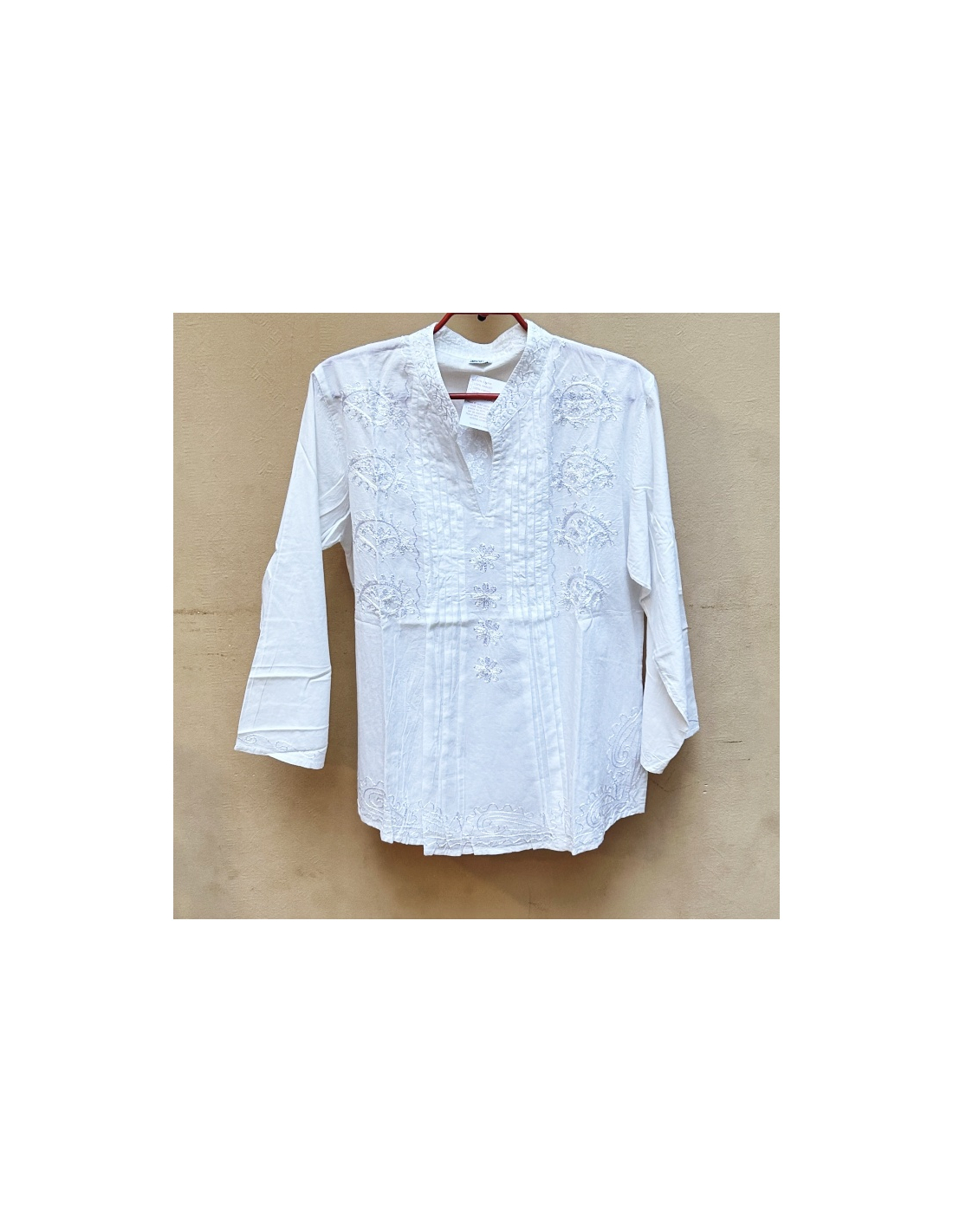 Vyšívaná bílá halenka s dlouhým rukávem, sámky podél rovného výstřihu a s vyšívaným stojáčkem, okraji rukávů a spodního okraje. Příjemný bavlněný materiál, vhodný k celoročnímu nošení.