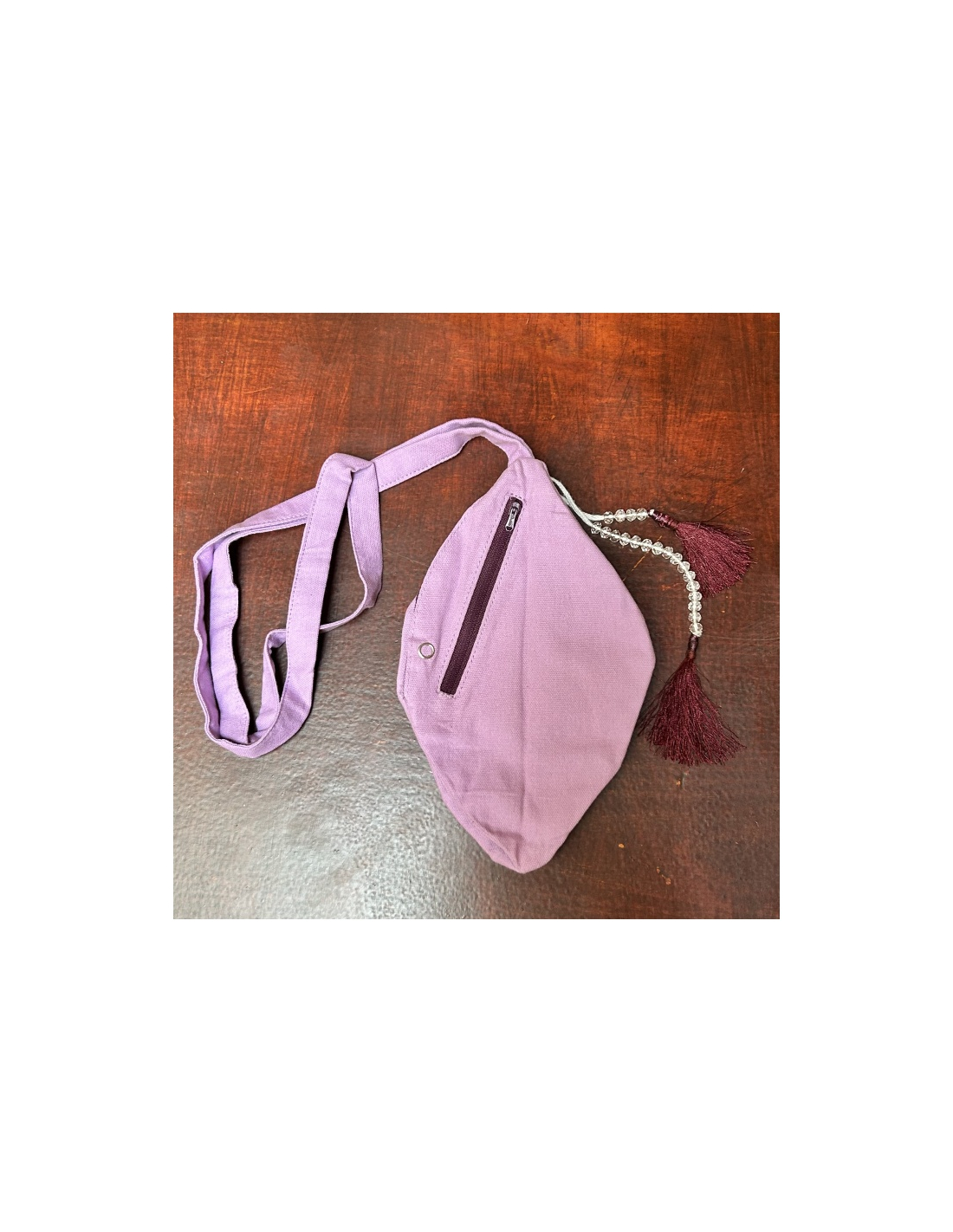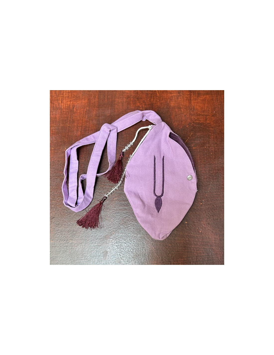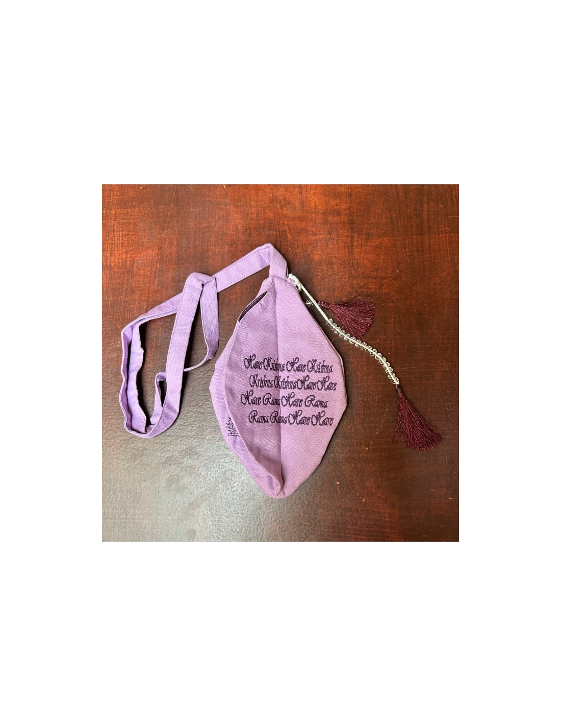 Kvalitní prostorný bavlněný japa pytlík na růženec s fialovou výšivkou Krišny na hadovi Kaliyi na horní straně, na další straně zprava je vyšitý znak tilaku, na další straně zleva je kapsička se zipem pro počítadlo. Na spodní straně je vyšitá mahá mantra v latince. K pytlíku je křišťálové počítadlo na fialovém vláknu.