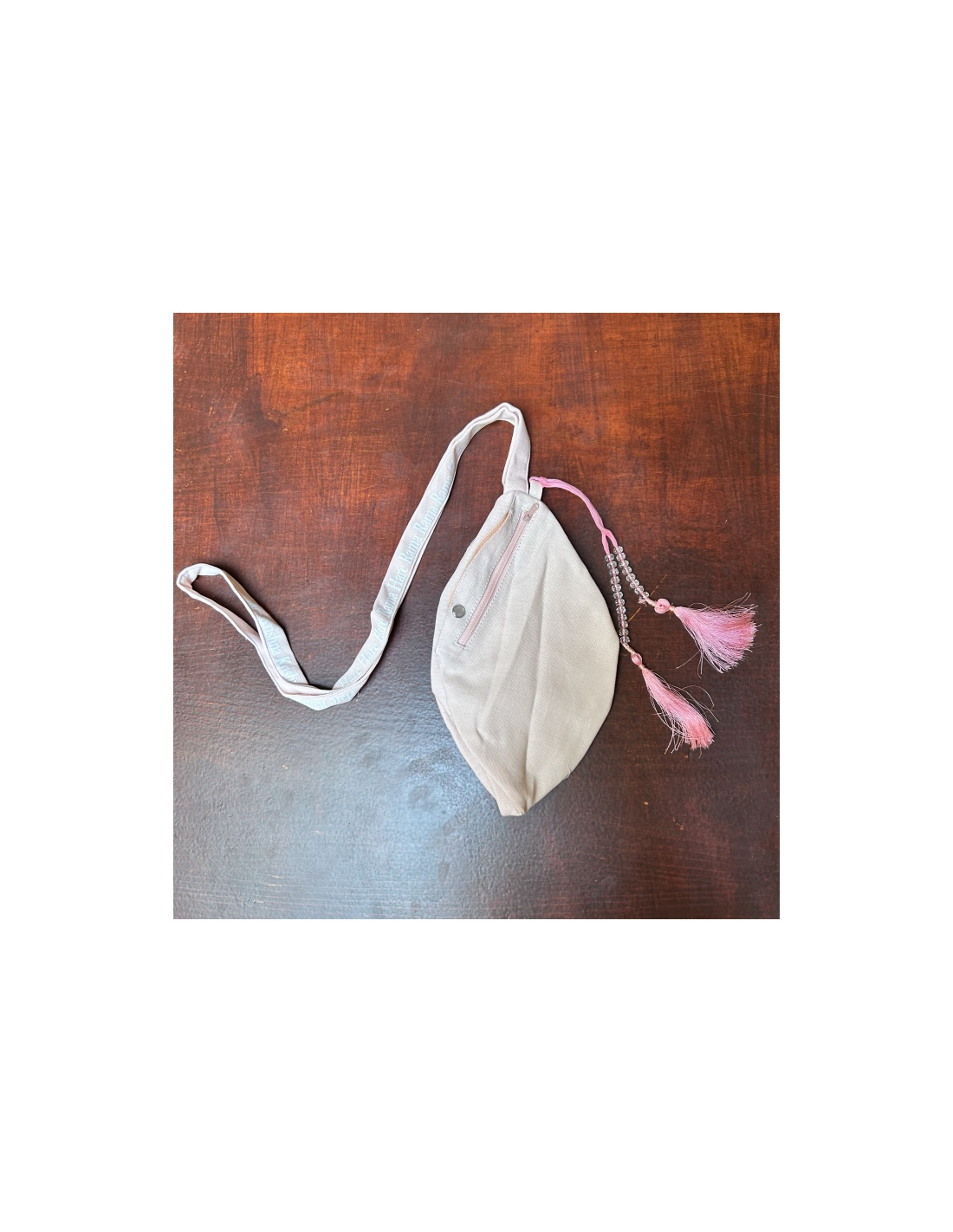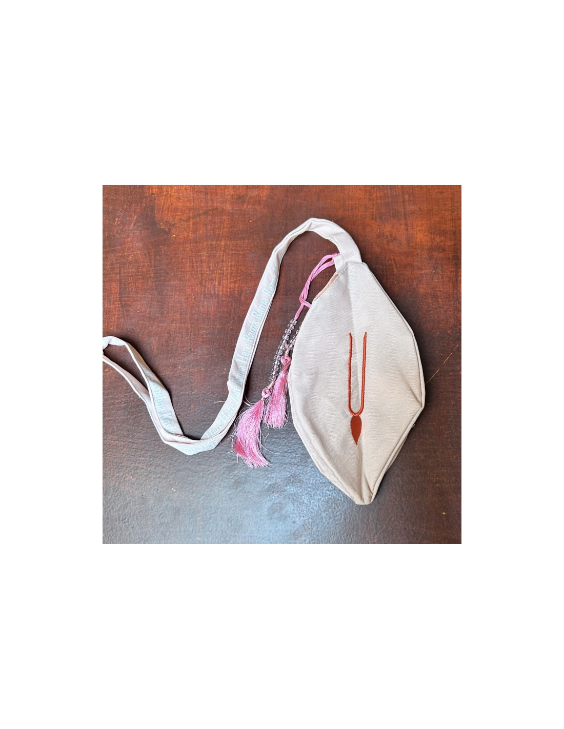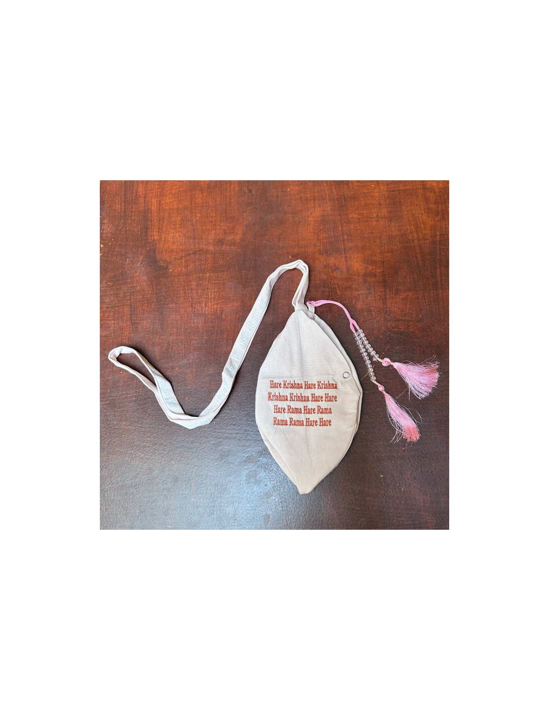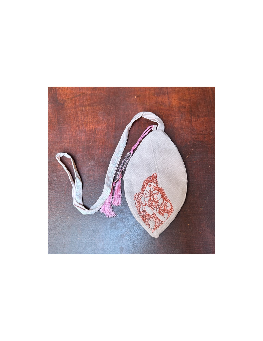 Kvalitní prostorný bavlněný japa pytlík na růženec s růžovou výšivkou Krišny s Rádharání na horní straně, na další straně zprava je vyšitý znak tilaku, na další straně zleva je kapsička se zipem pro počítadlo. Na spodní straně je vyšitá mahá mantra v latince. K pytlíku je křišťálové počítadlo na růžovém vláknu.