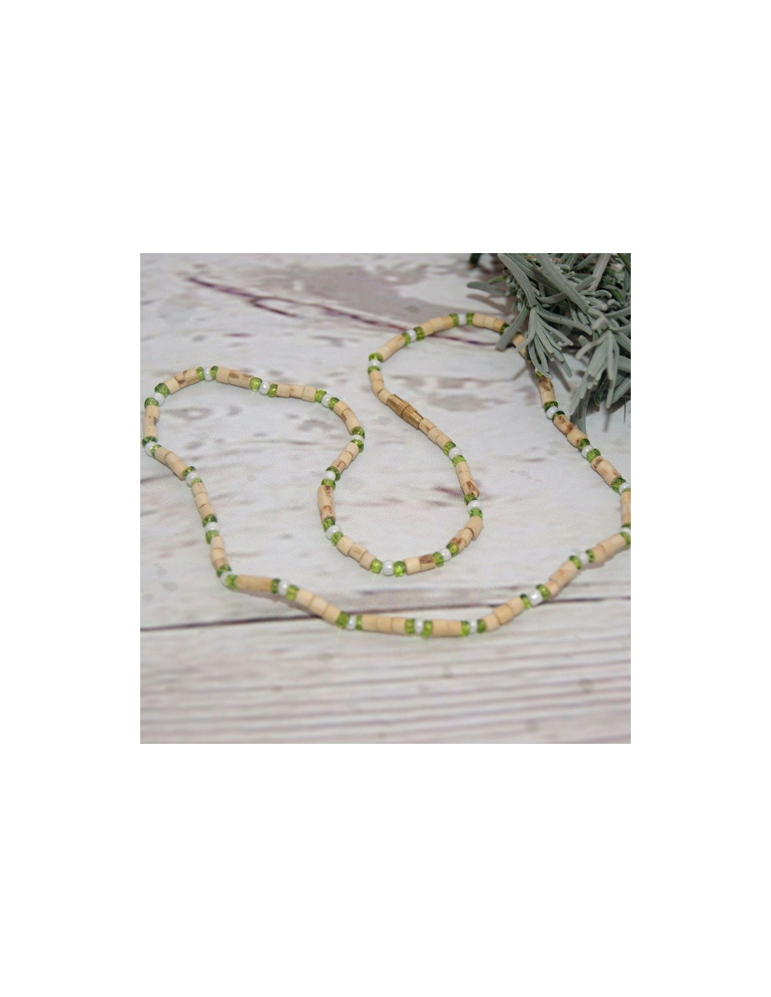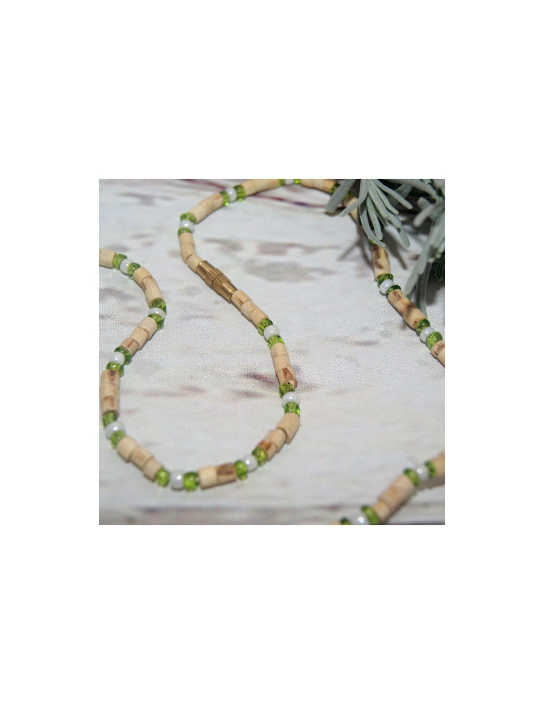 Jednořadá kantimála se světle zelenými korálky a perlami vyrobená z posvátného keříku tulasí. Ochraňuje.