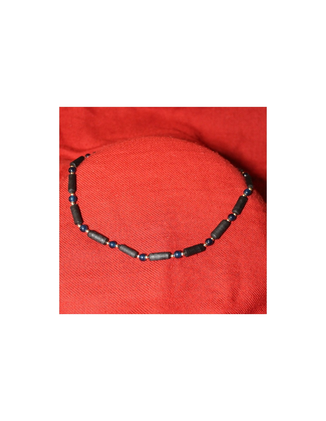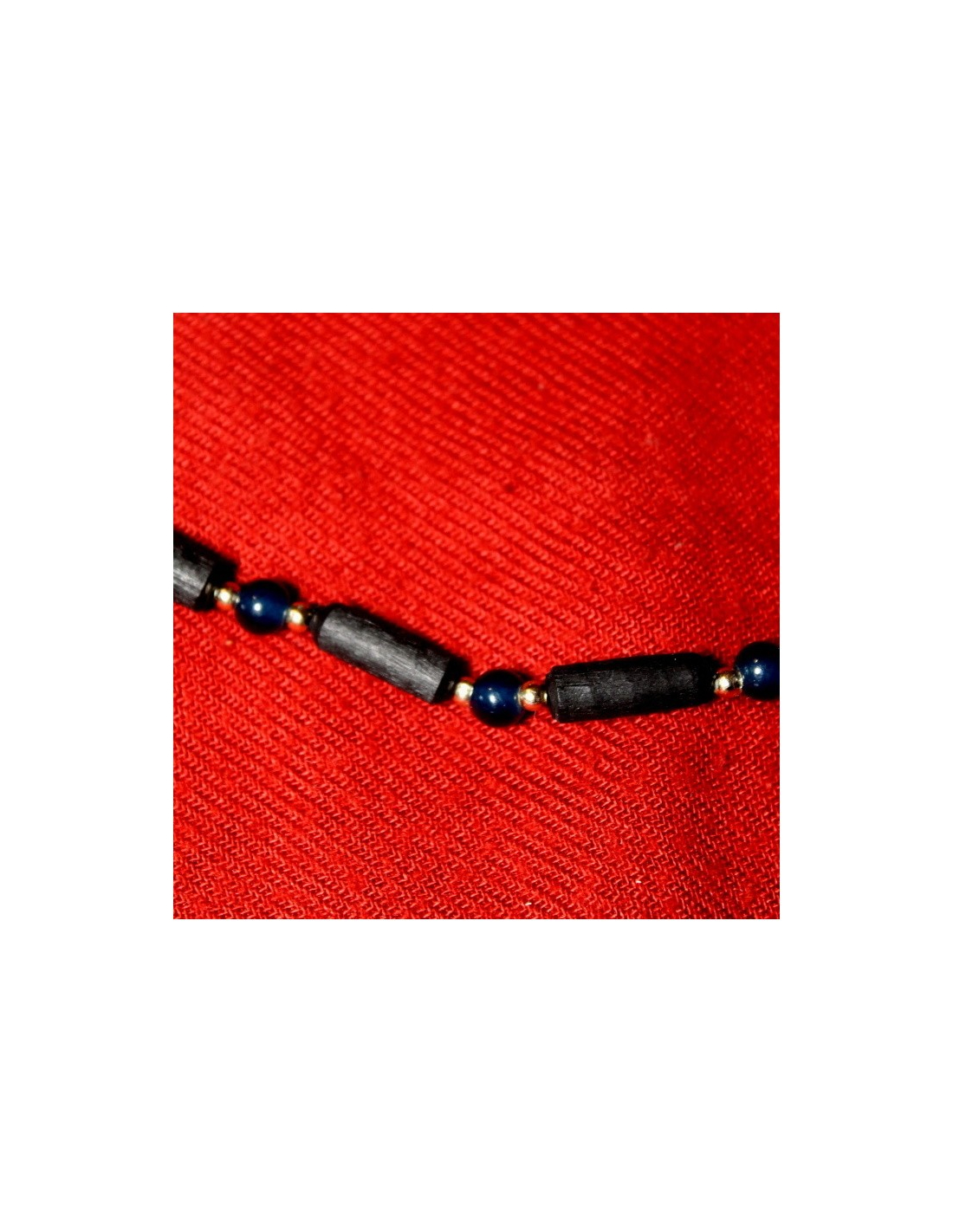 Jednořadá černá kantimála vyrobená z posvátného keříku tulasí. Ochraňuje. S modrými kamínky.