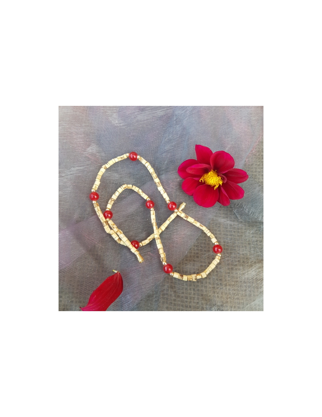 Jednořadá kantimála vyrobena z posvátného keříku tulasí, s barevnými korálky. Ochraňuje.