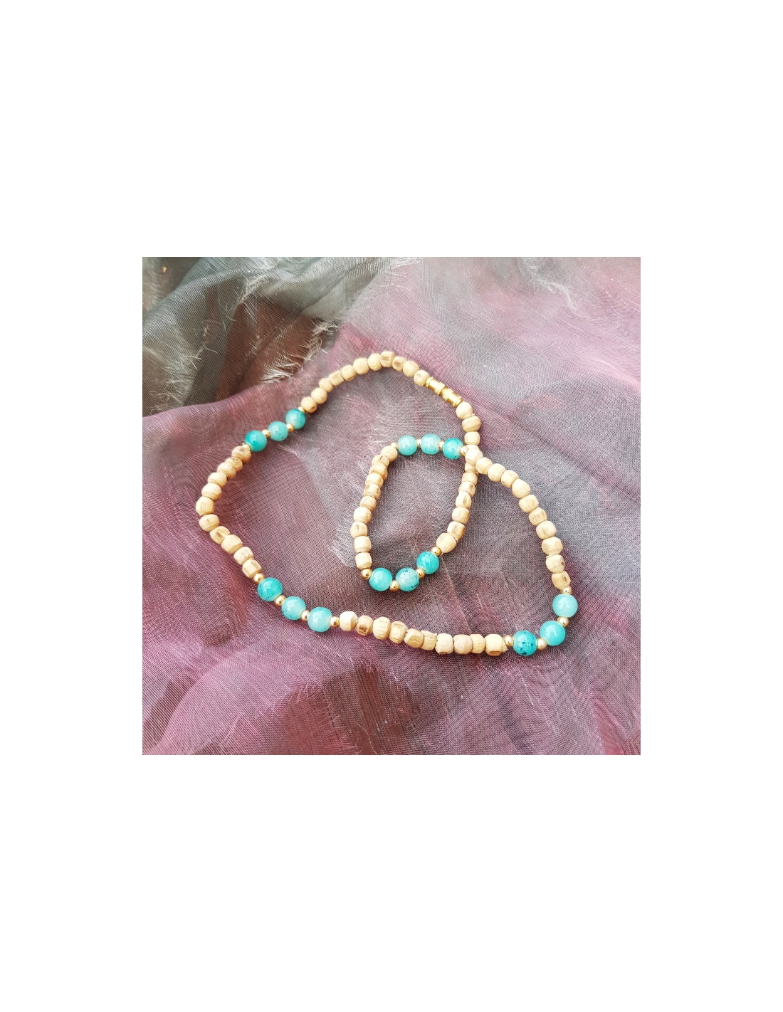 Jednořadá kantimála vyrobená z posvátného keříku tulasí s barevnými korálky. Ochraňuje.