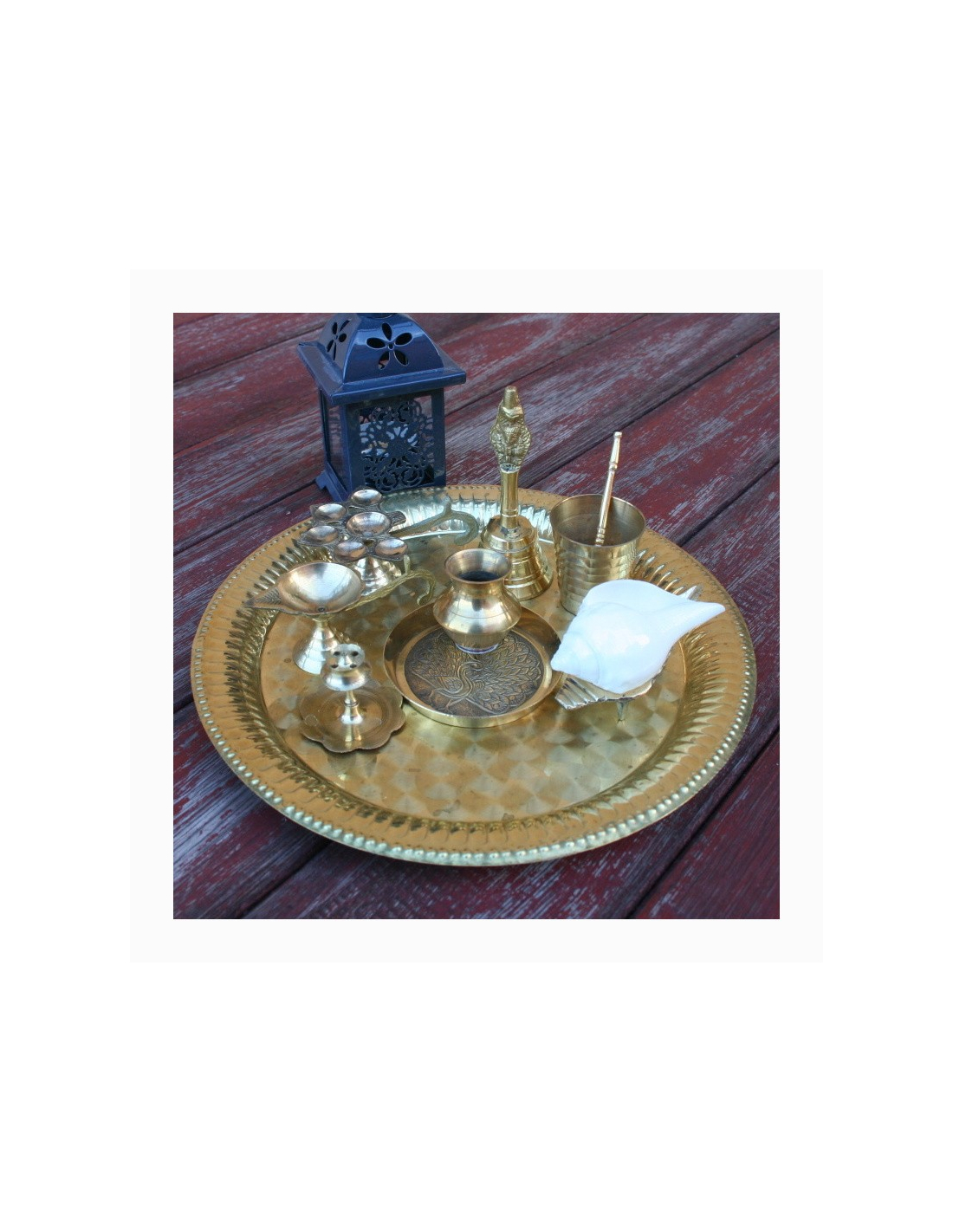 Arati tác o průměru 21 cm s osmi díly (2 pohárky, talířek se lžičkou, 2 lampičky, zvonek, stojan na tyčinky, podložka pod lasturu) k uctívání božstev.