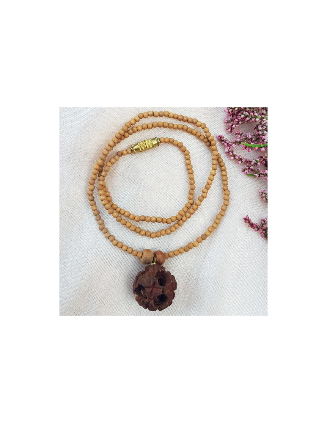 Dřevěné korálky s přívěškem z plodu rudrakša.