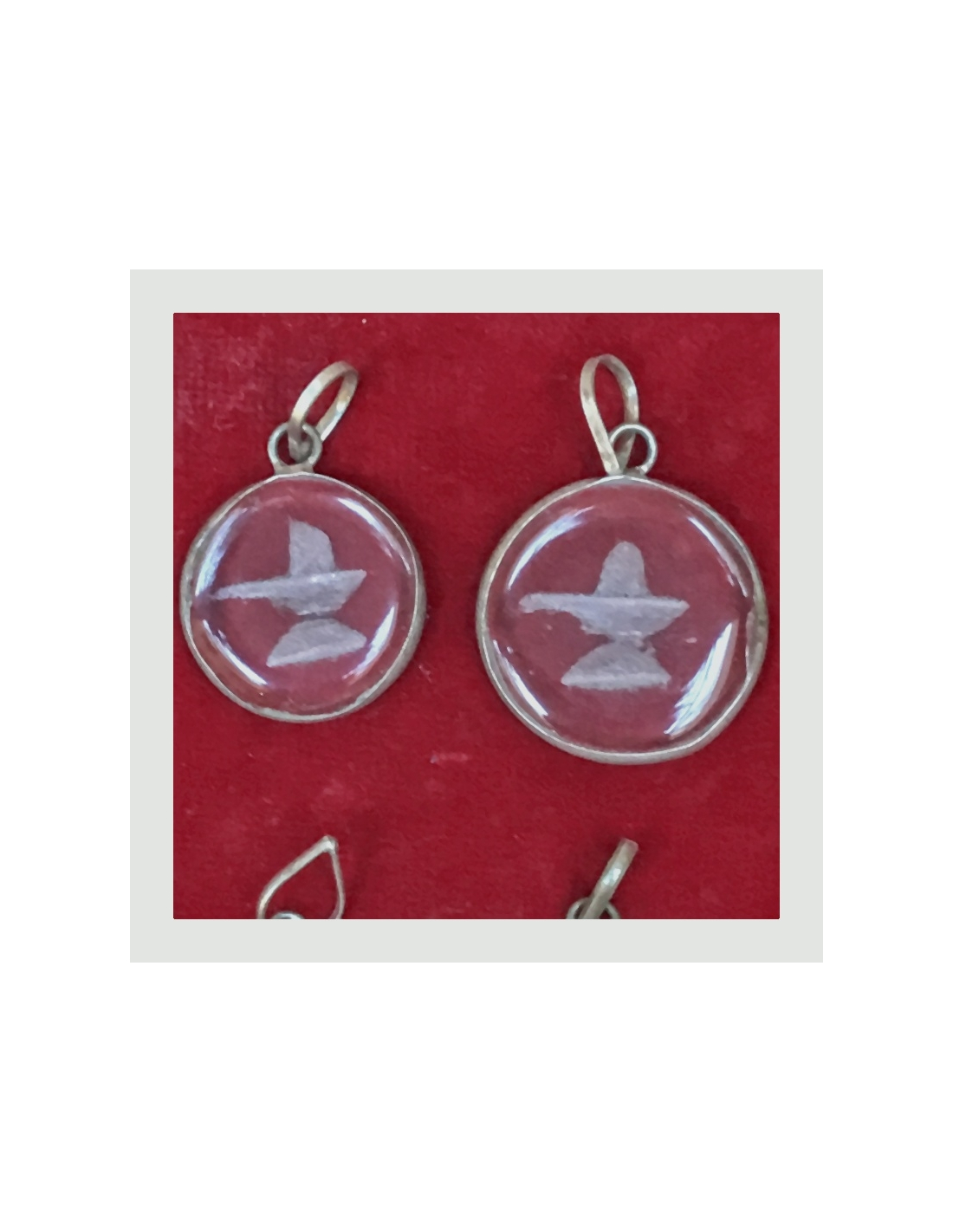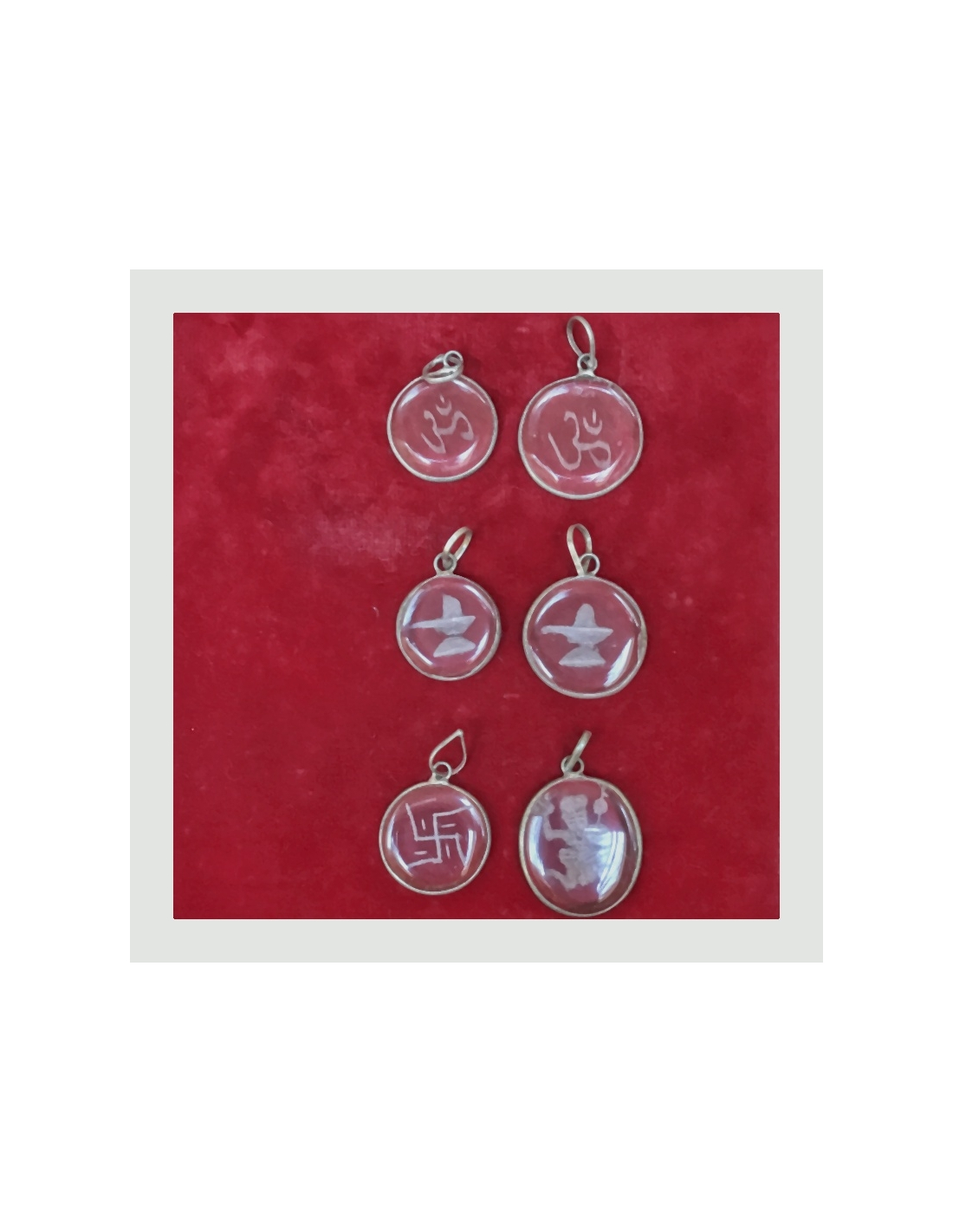 Přívěšek ze skla s vybroušeným znakem Šivalingamu vsazený do stříbra.