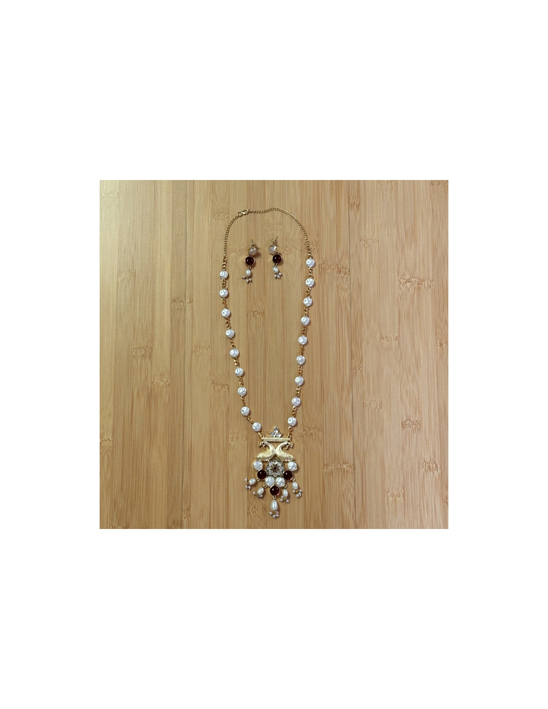 Dámský náhrdelník se závěsem s pávy s perleťovými a červenými korálky a s náušnicemi.