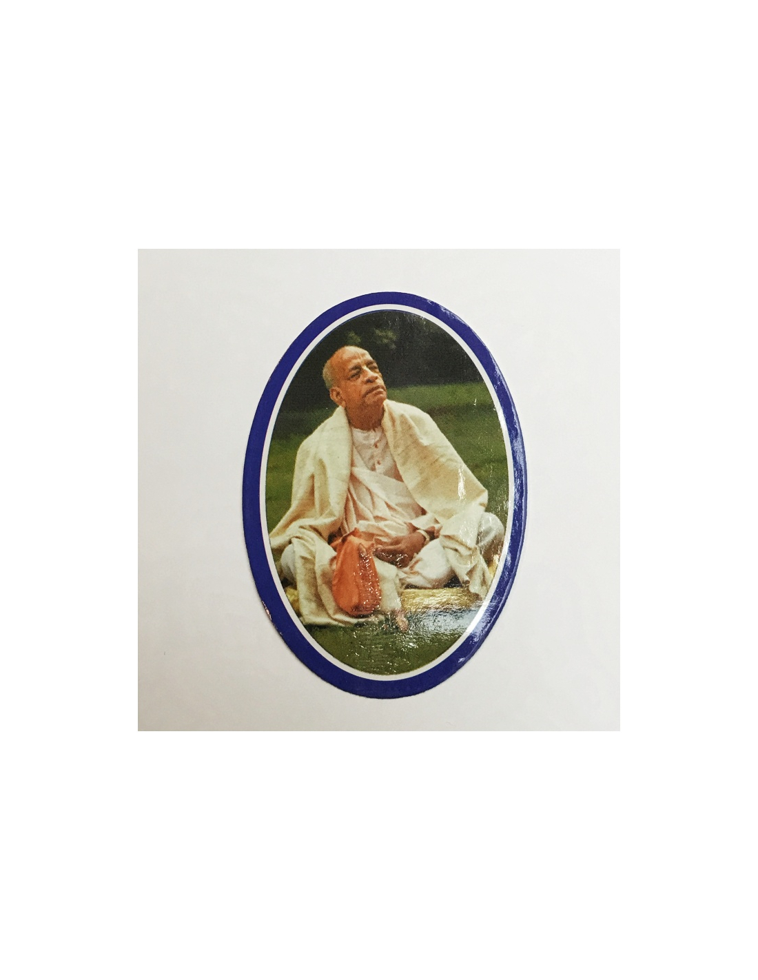 Nálepka oválného tvaru s obrázkem Šríly Prabhupády.