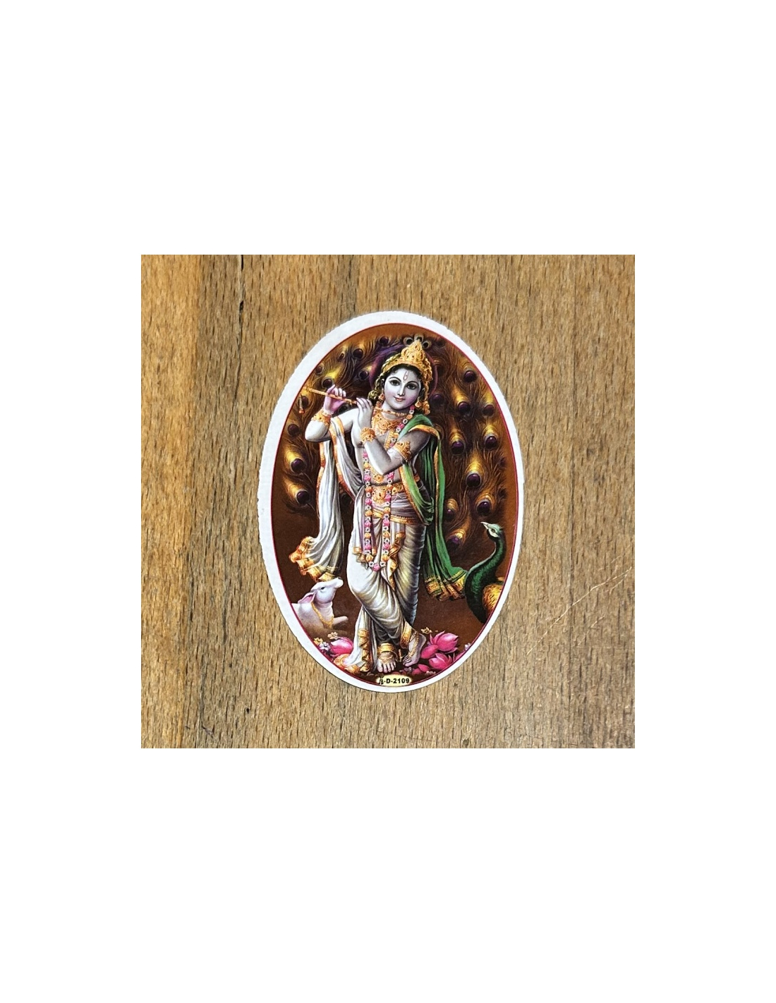 Nálepka oválného tvaru s obrázkem Krišny v jinošském věku.