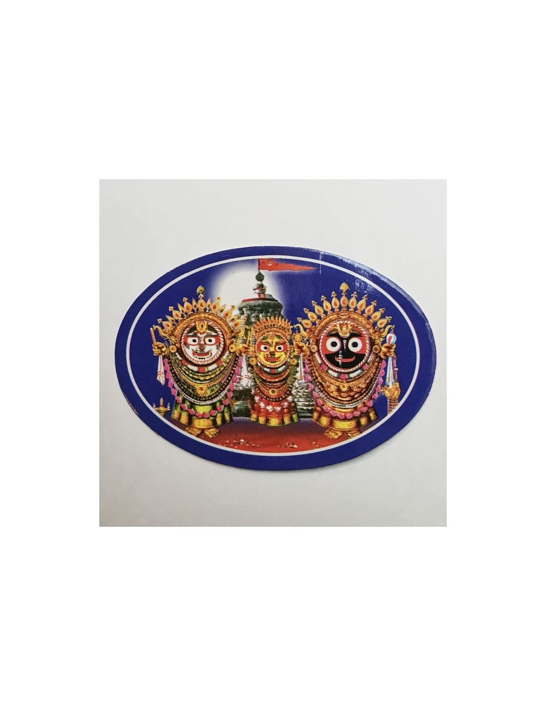Nálepka oválného tvaru s obrázkem Jagannátha, Subhadry a Baladévy.