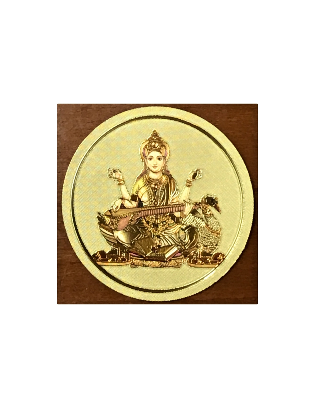 Zlatá samolepka s obrázkem. Sarasvatí je bohyní vzdělání, řeči, umění a hudby. Je spojována s čistotou, kreativitou, uměleckým vyjádřením a harmonií.
