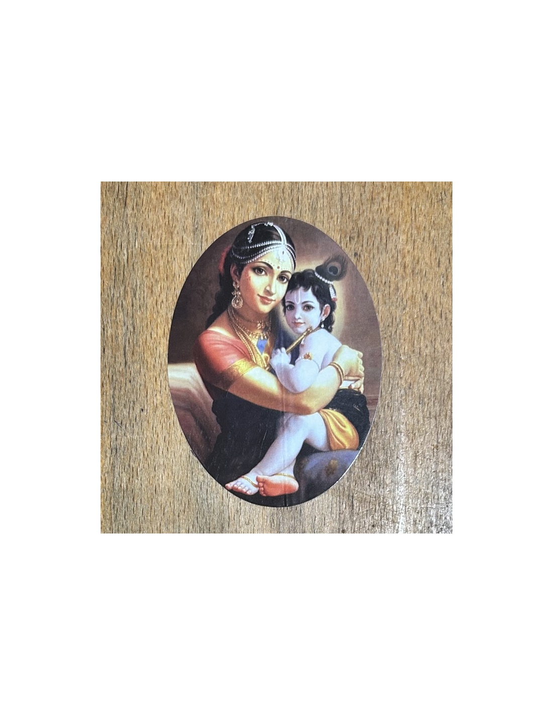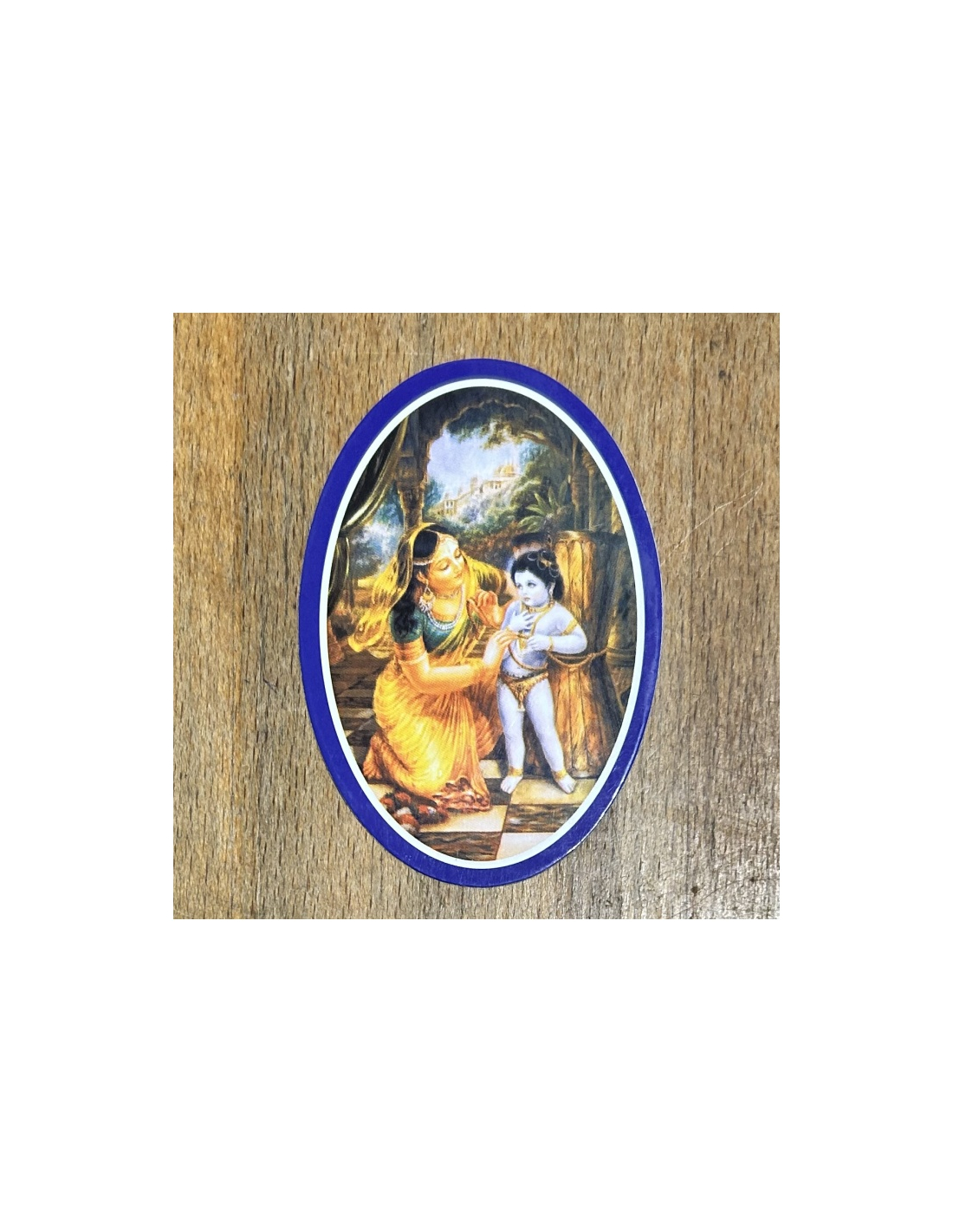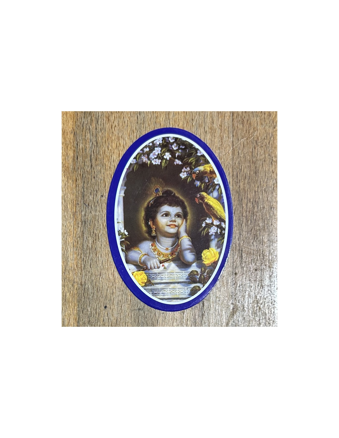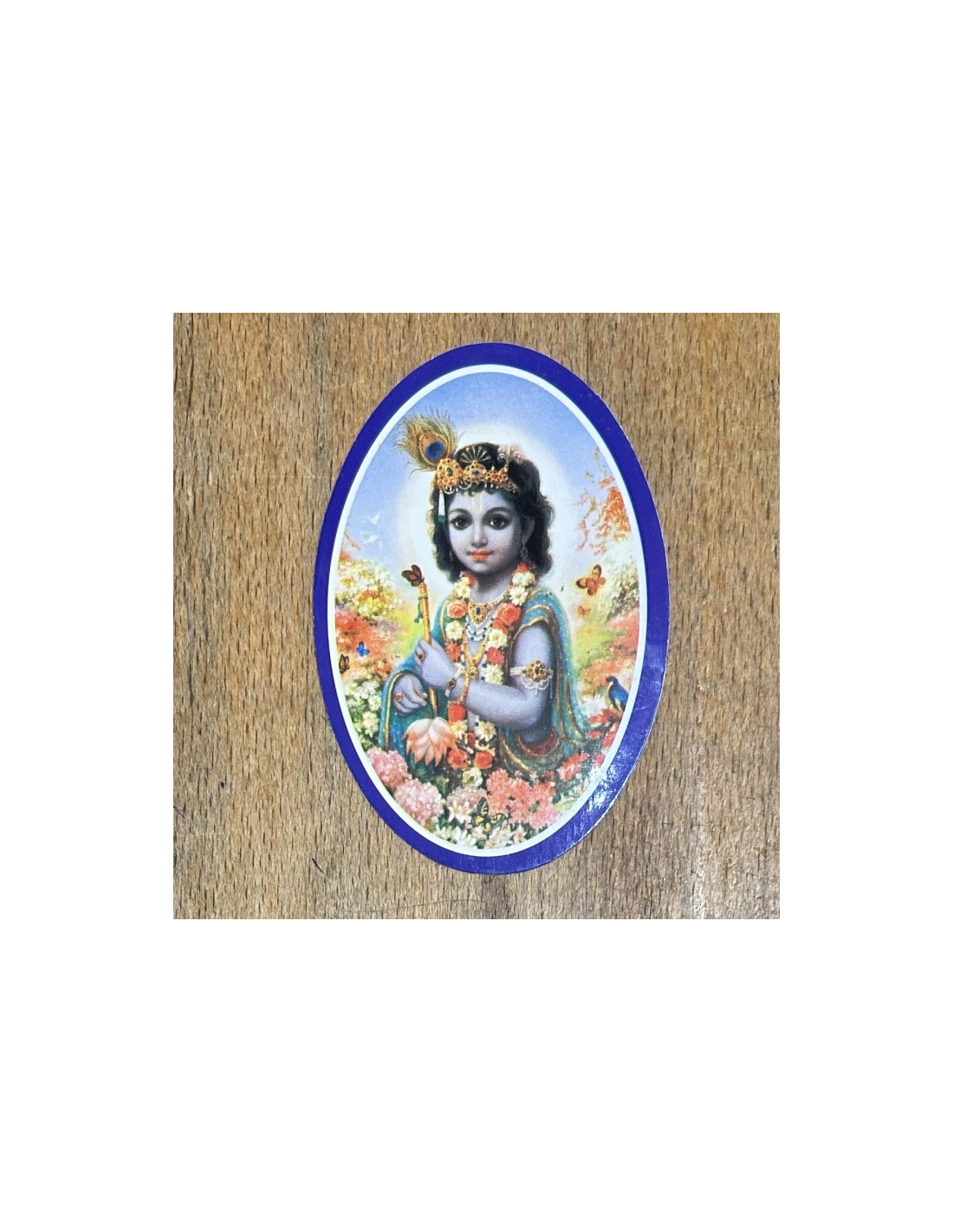 Oválná samolepka se zobrazením Krišny v dětském věku (kumára). K výberu ze čtyř typů.