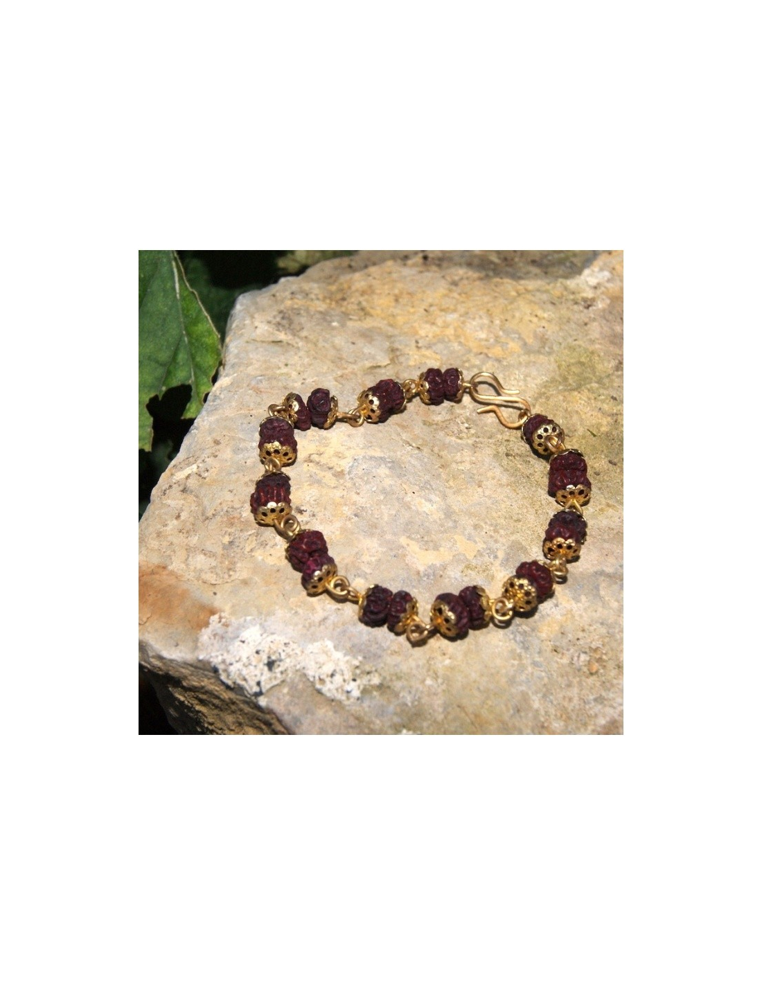 Náramek má ozdobné zlaté komponenty s menšími kuličkami rudrakša.