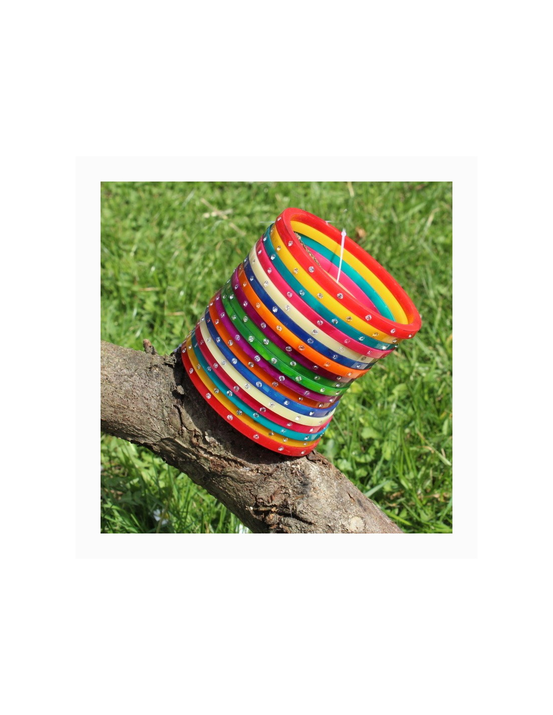 Sada 18 barevných náramků s kamínky s velikostí v každé sadě se změnšující k prostředku sady o cca 1 cm.