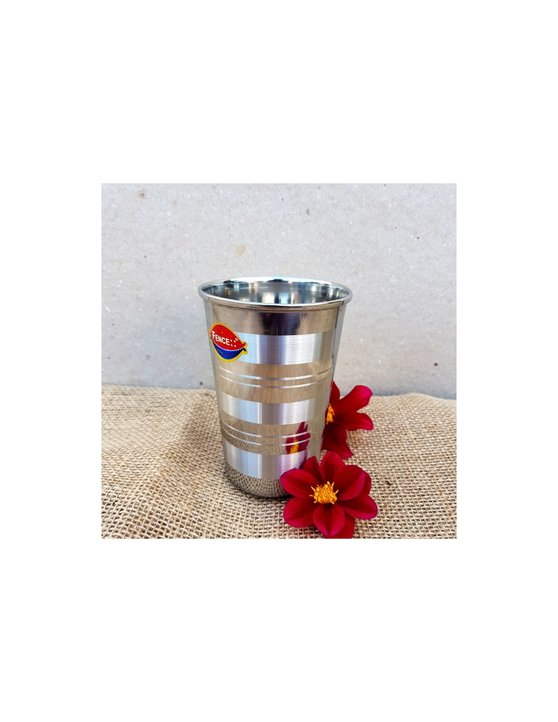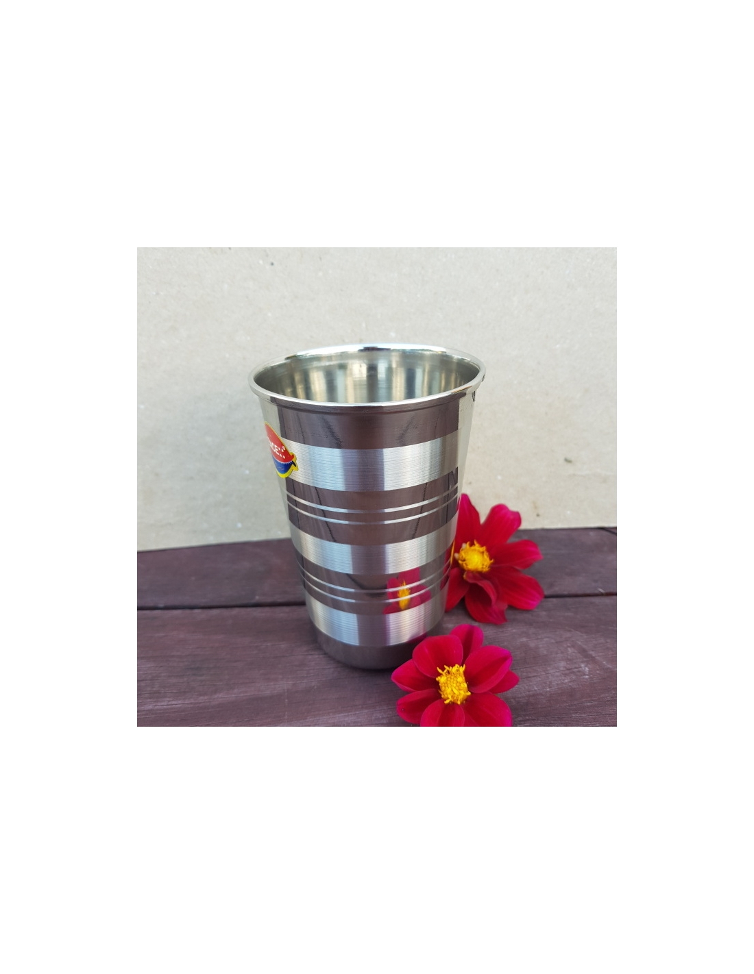 Pohár nerezový zdobený pruhy.