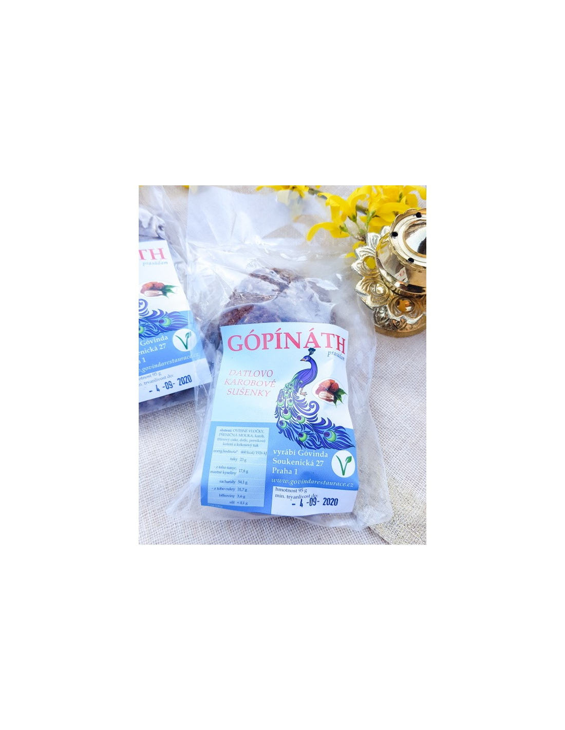 Datlovo-karobová sušenka z ovesných vloček, pšeničné mouky, karobu, třtinového cukru, datlí, perníkového koření a kokosového tuku.Balíček obsahuje 2 sušenky.
