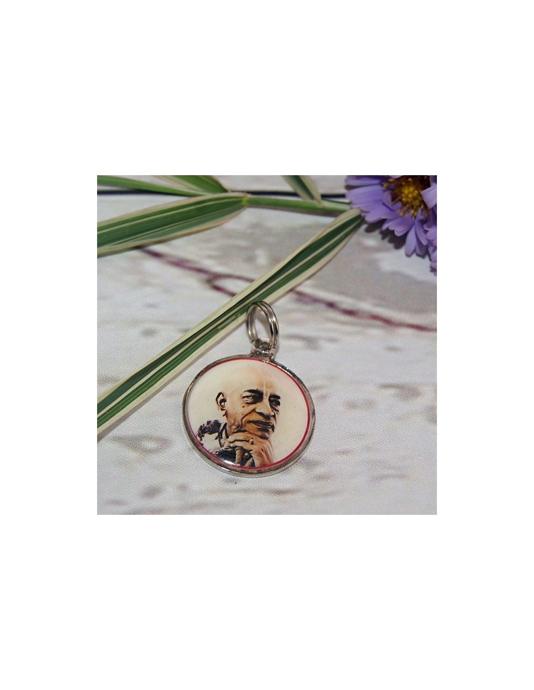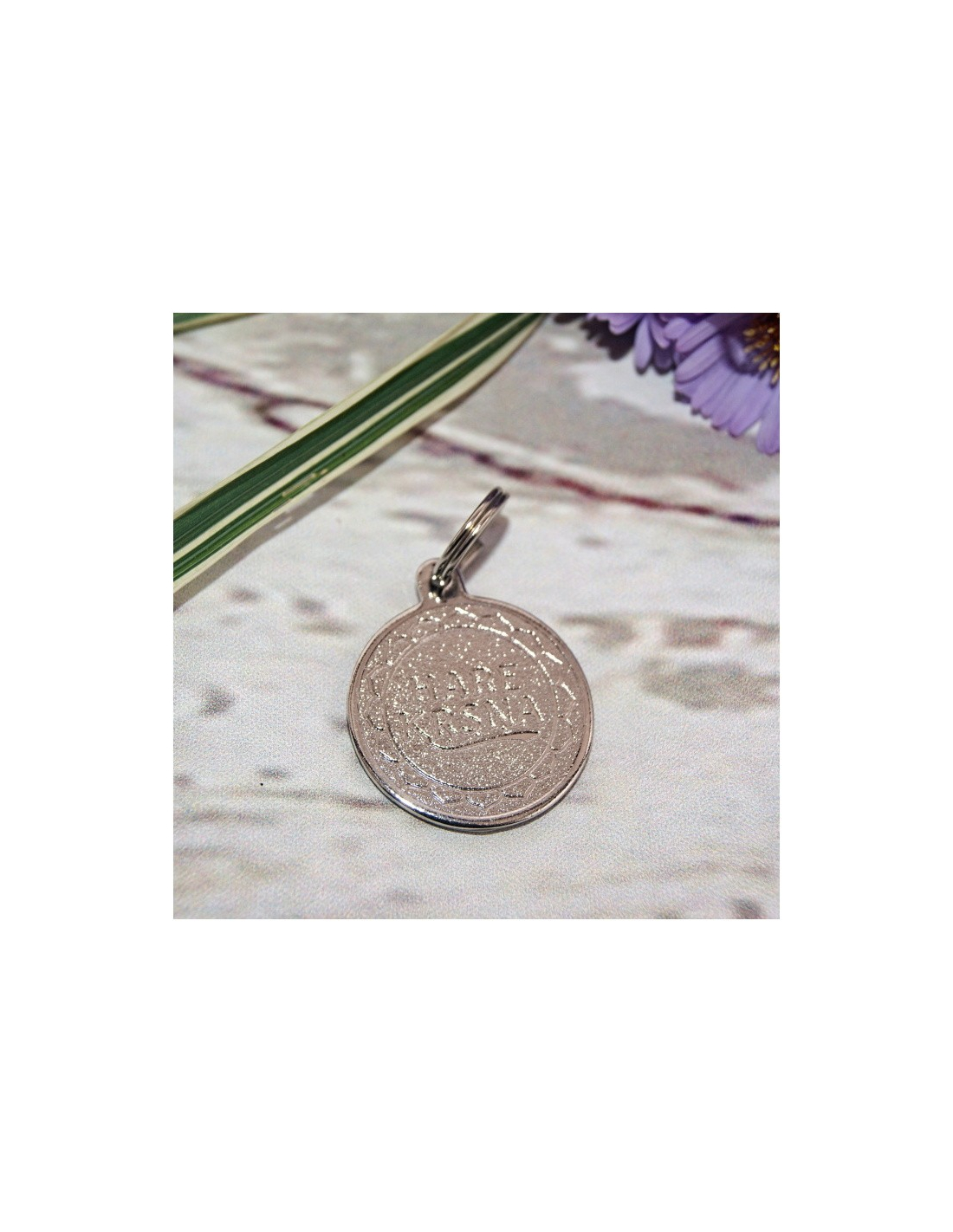 Klíčenka, možnost nosit i na šňůrce na krku. Na zadní části nápis Hare Krsna.