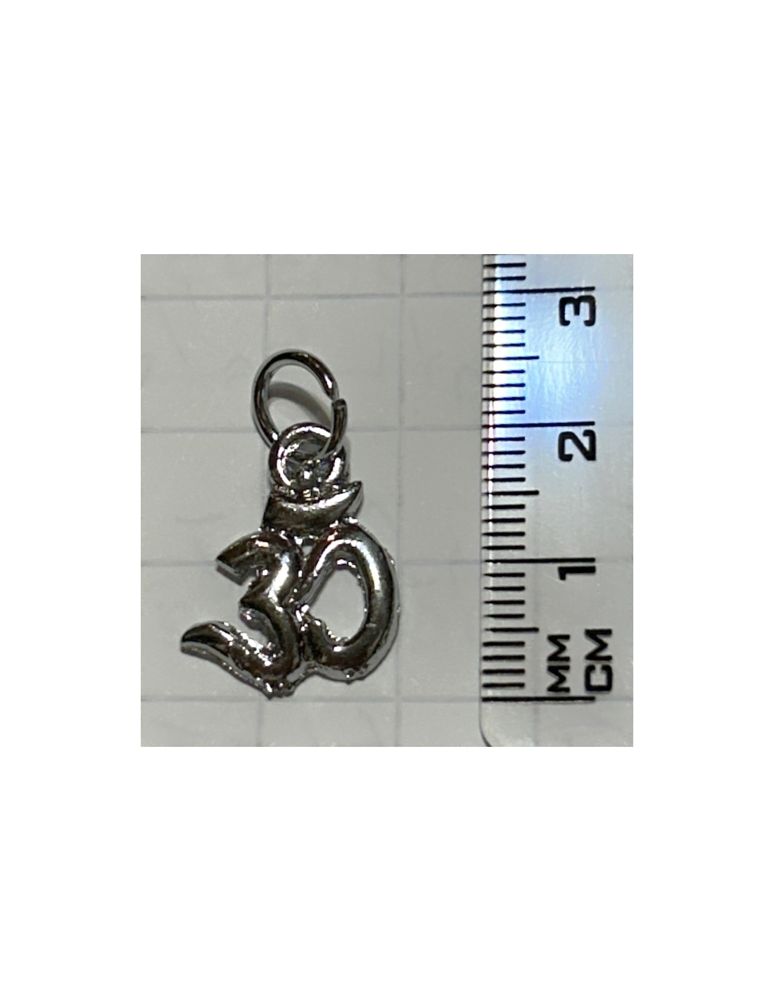 Přívěšek ve tvaru ÓM ze světlého kovu.