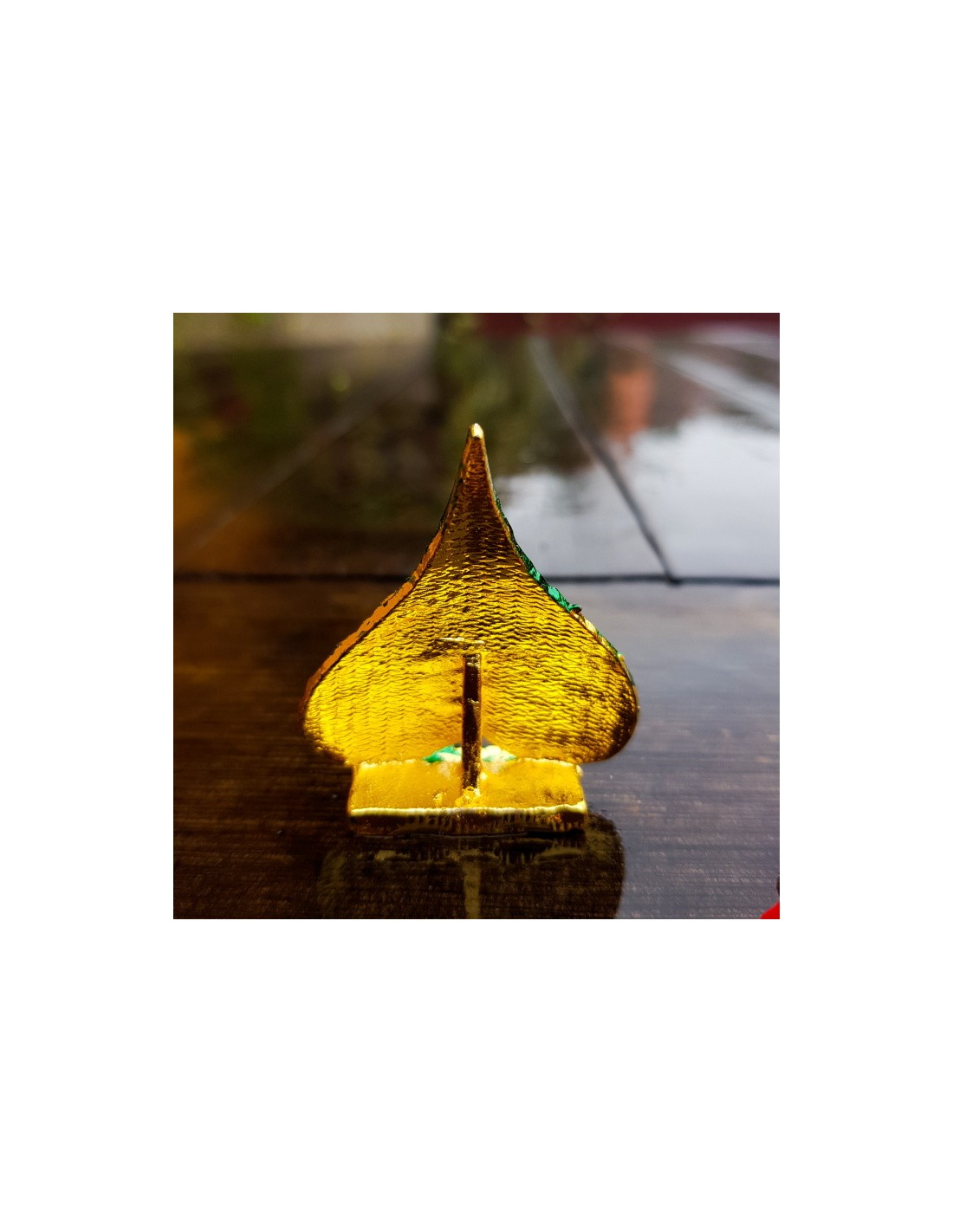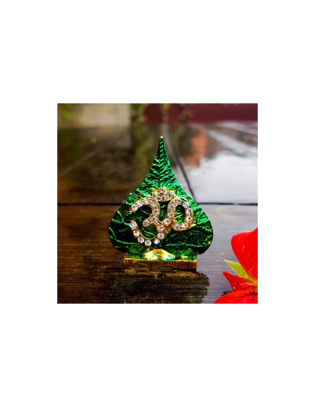 Menší murti Óm na lístku z pozlaceného kovu. V dárkové krabičce.