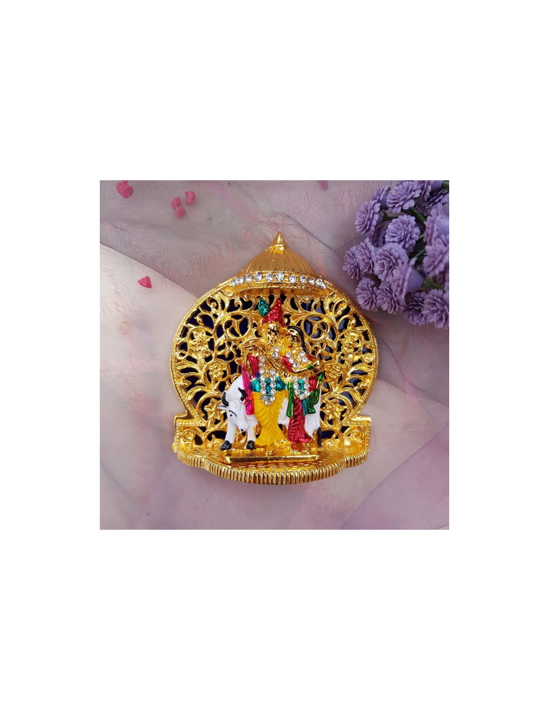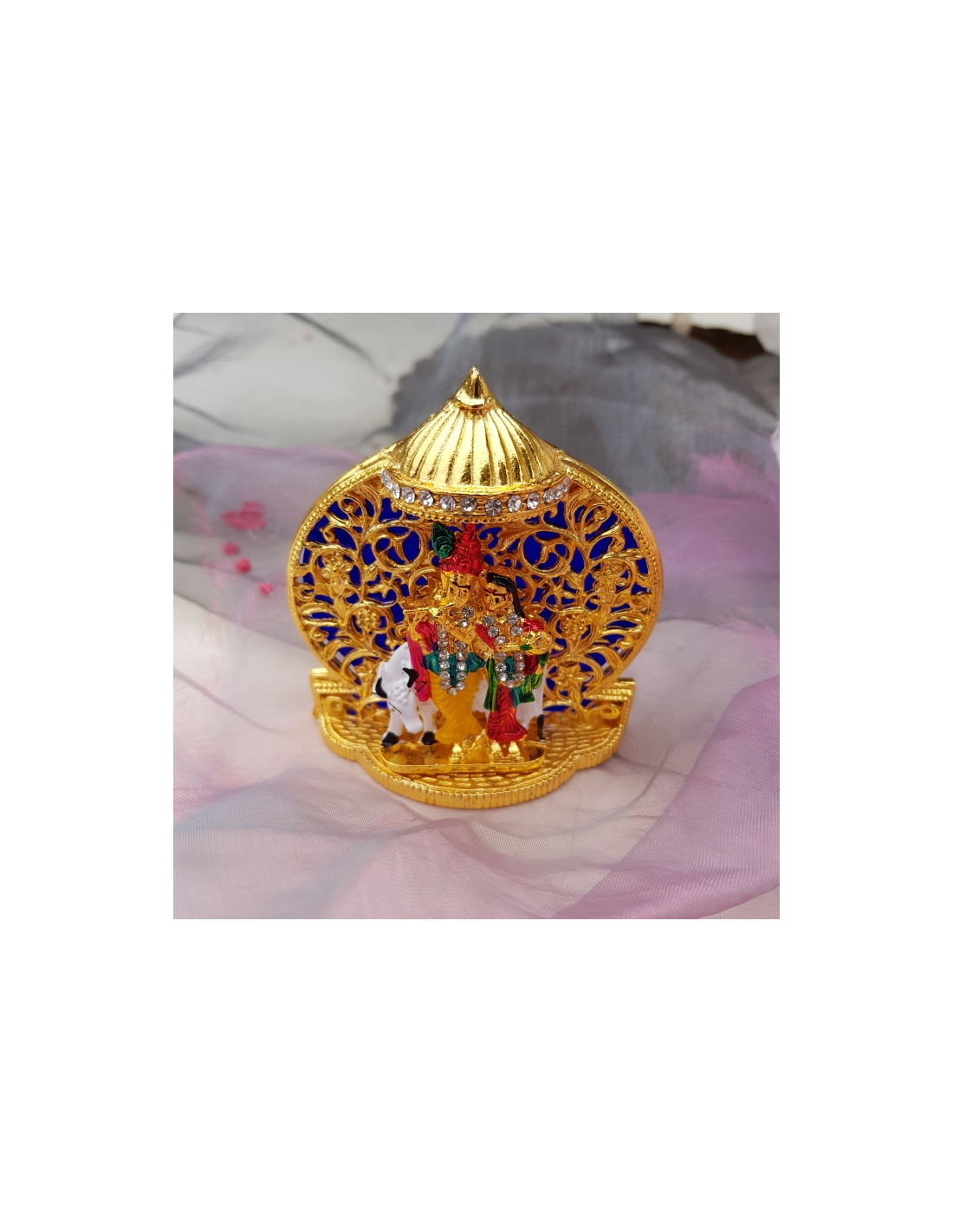 Murti Radha Krišna z pozlaceného kovu. V dárkové krabičce. Nádherné pozadí.