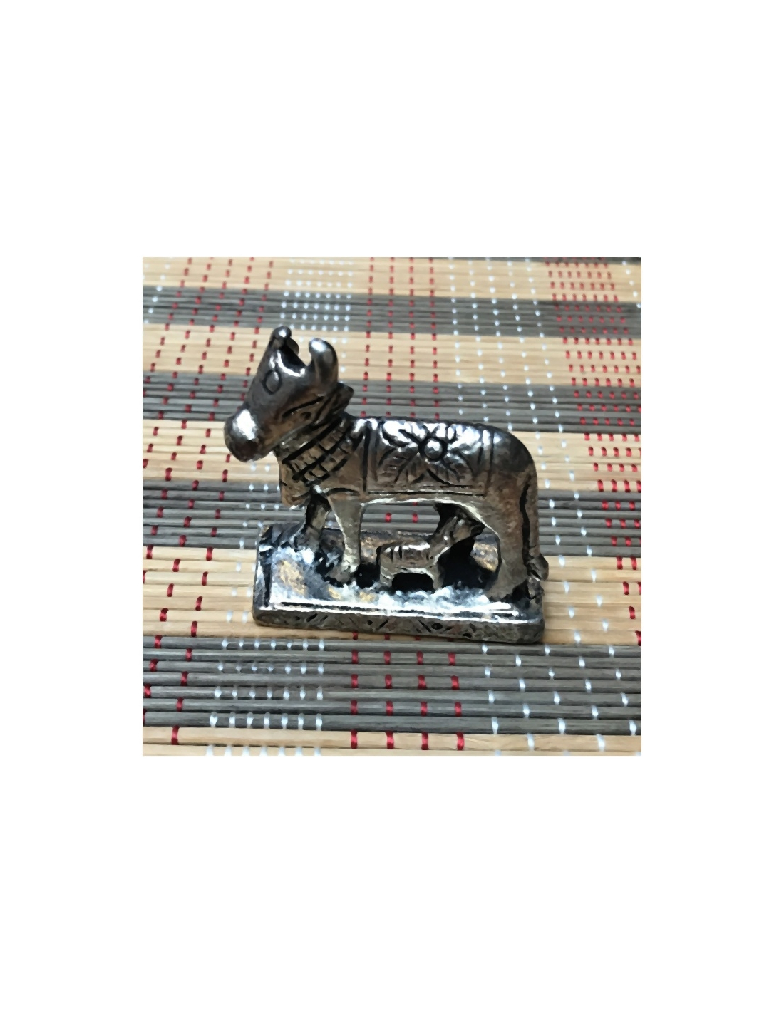 Kravička s telátkem z kovu stříbrné barvy.