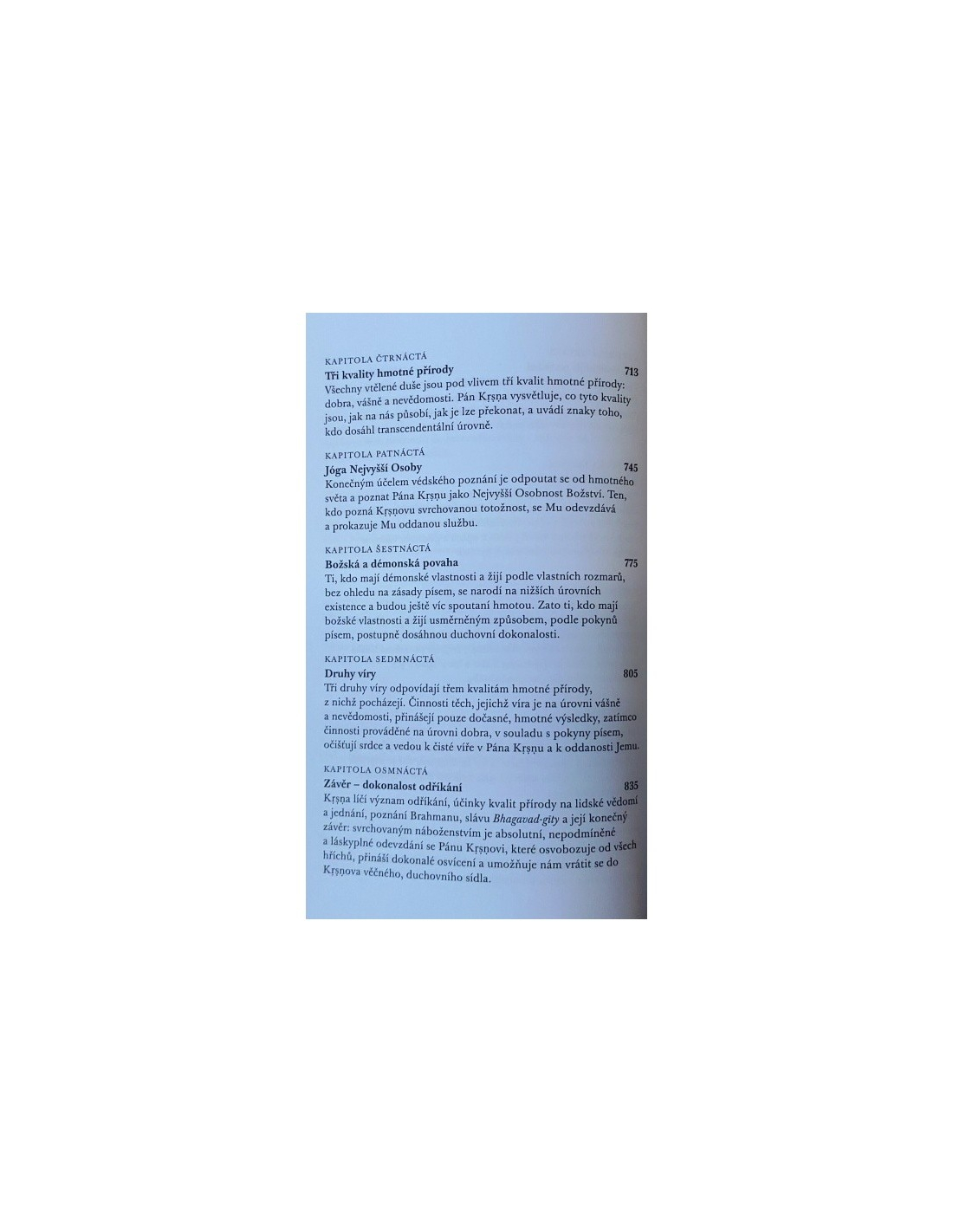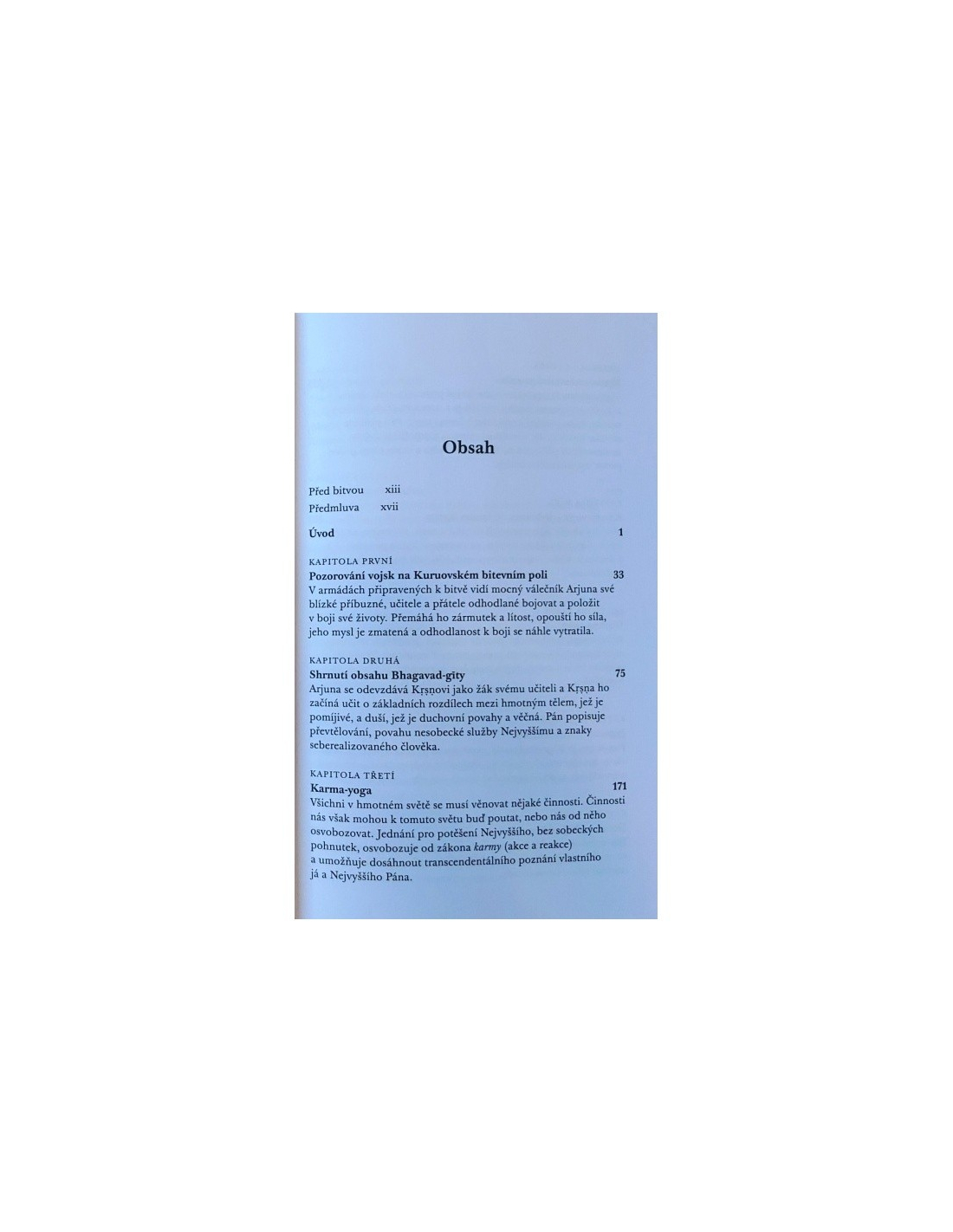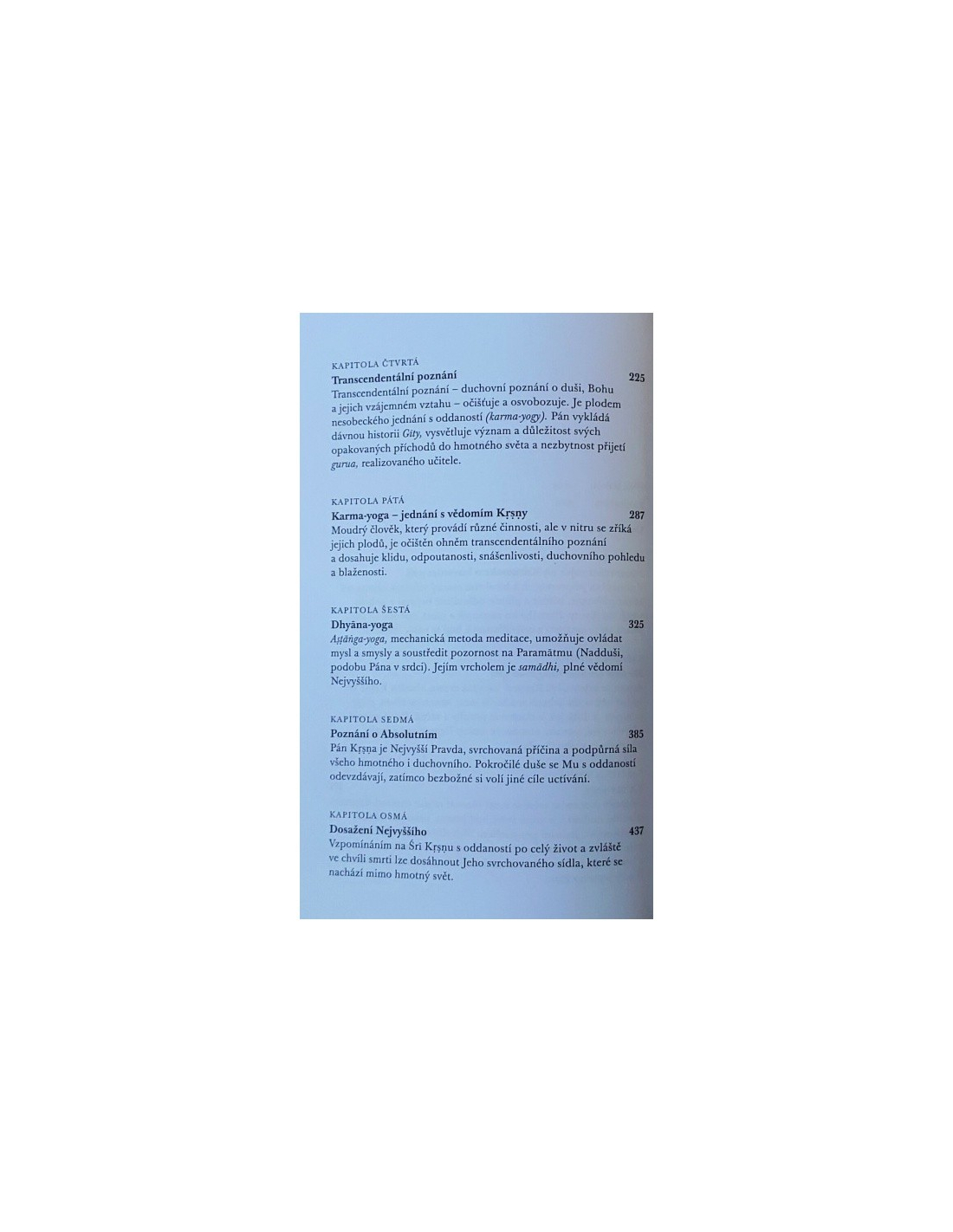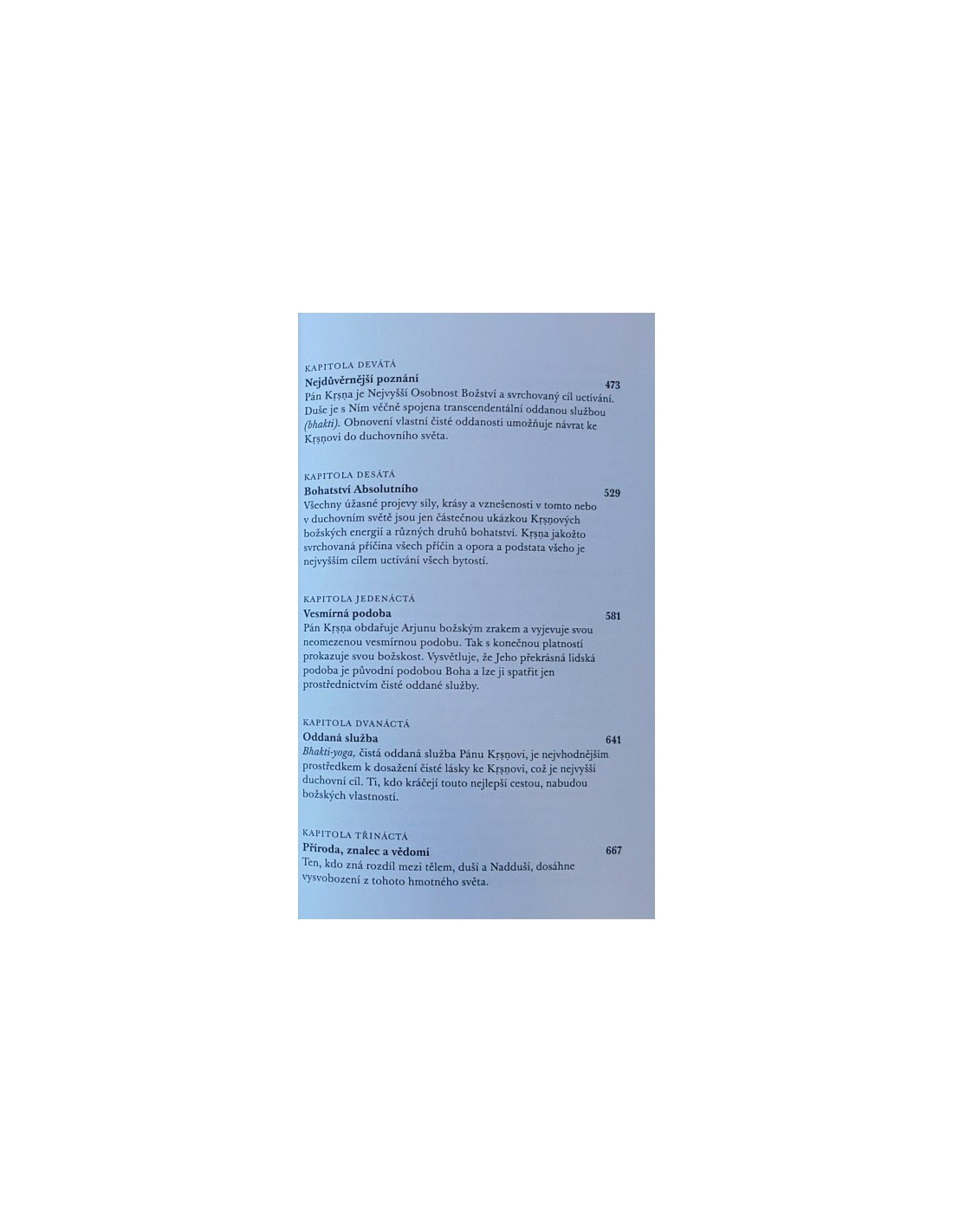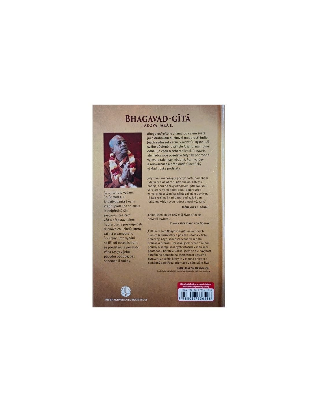 Drahokam duchovní moudrosti Indie, ve kterém Šrí Krišna svému důvěrnému příteli Ardžunovi plně vyjevuje vědu o seberealizaci a tajemství vědomí, karmy, jógy a reinkarnace. Toto vydání představuje poselství Pána Krišny v jeho původní nezměněné podobě.
