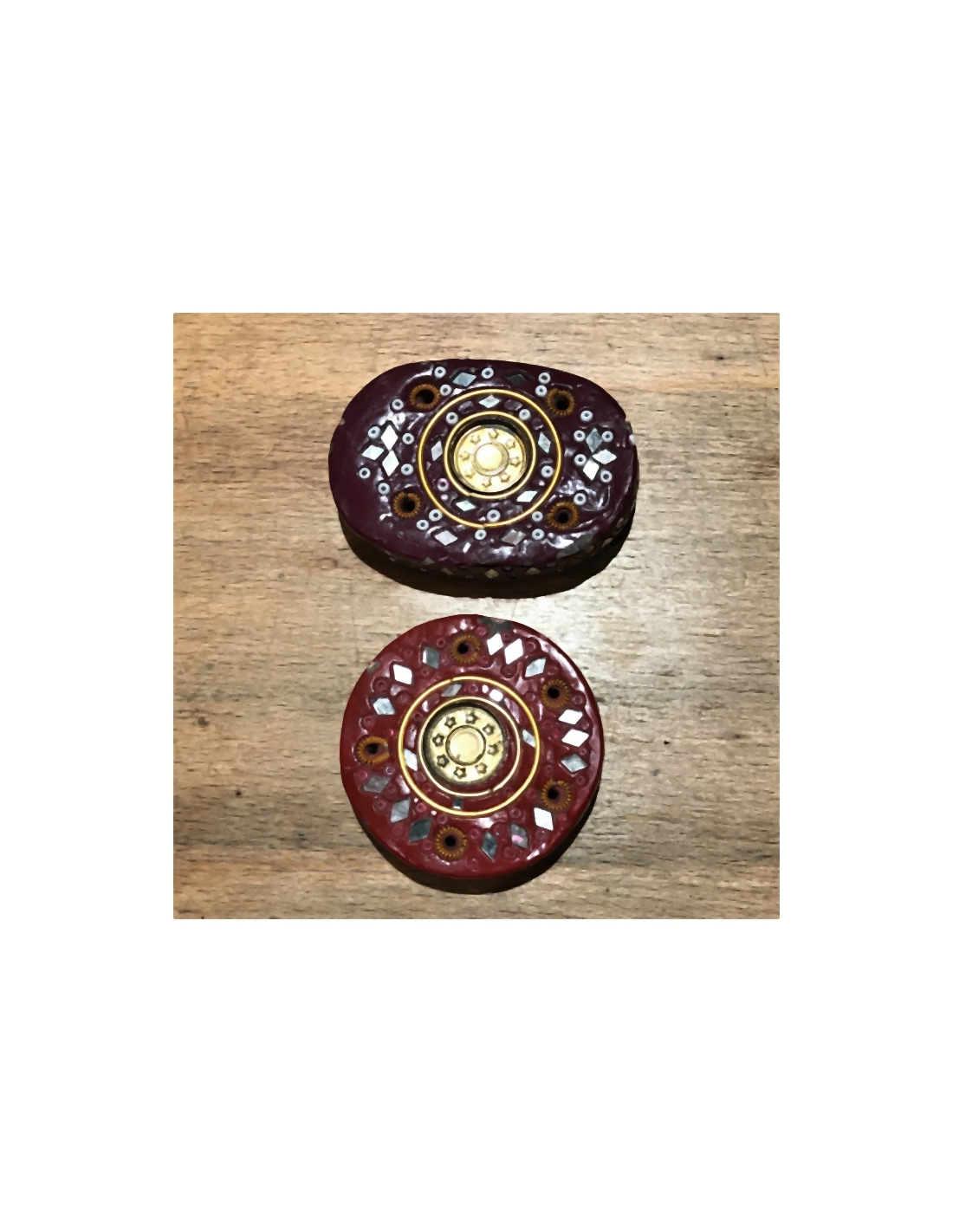 Stojánek na tyčinky z barveného kamene zdobený rádžastánskými sklíčky, kulatý v červené barvě nebo oválný v barvě bordó.