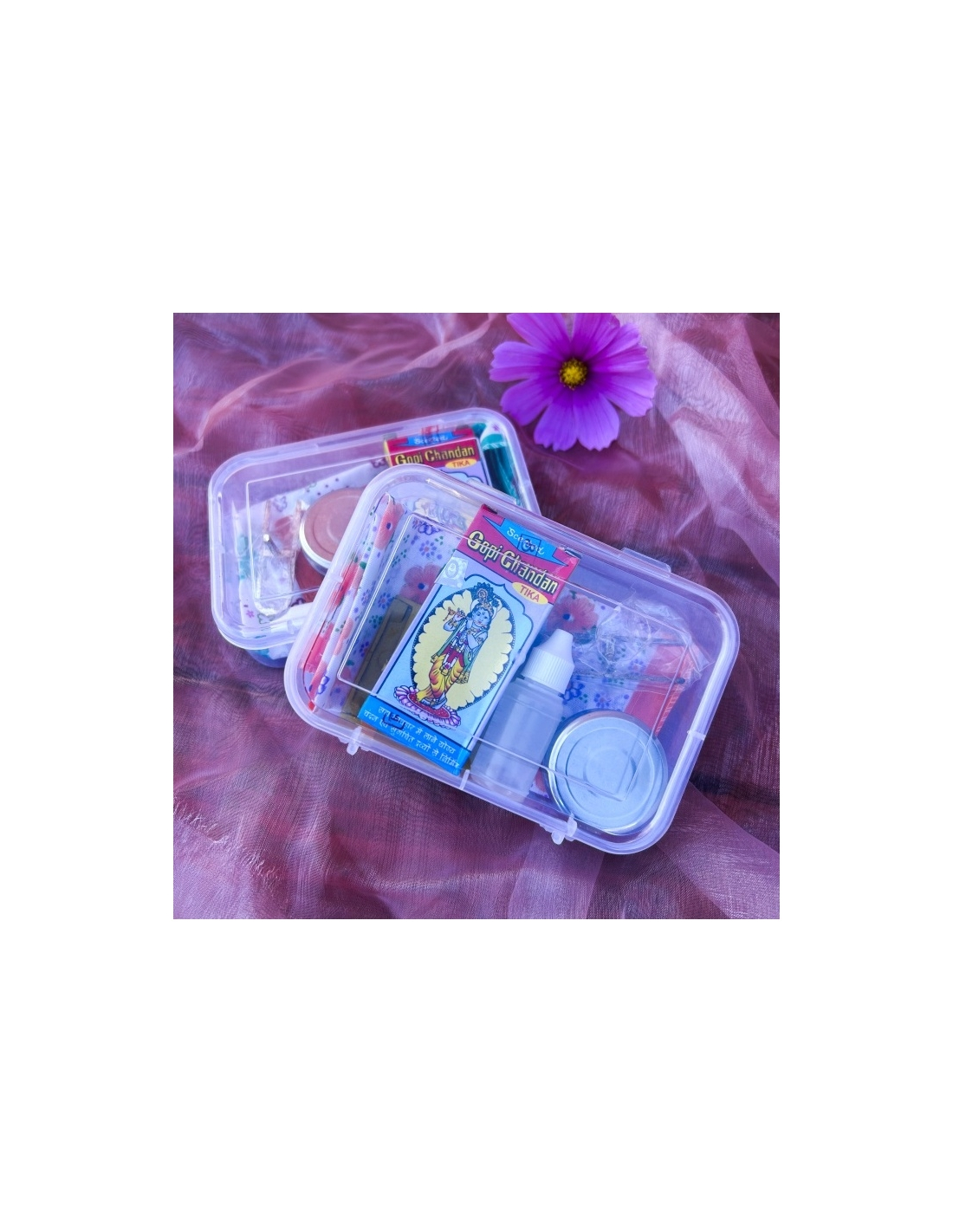 Set obsahuje 6 ks: Tilak, kapesníček, tiskátko, lahvička na zředění, zrcátko, kulatá malá krabička.