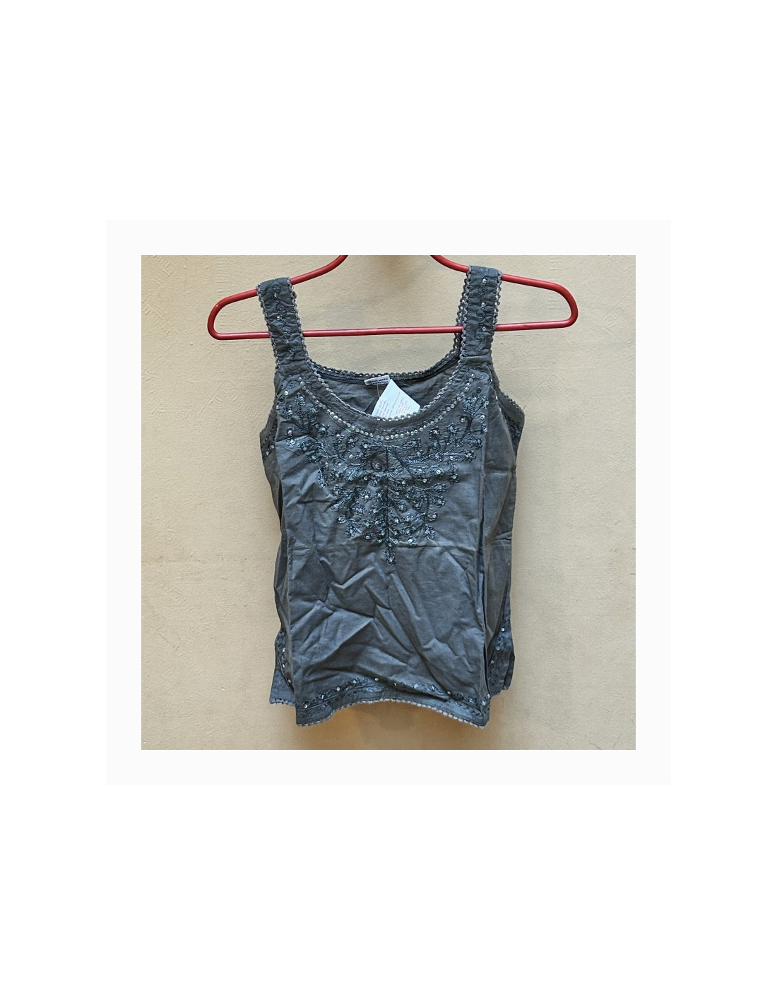 Top se širšími ramínky, jednobarevný, vyšívaný nití stejného odstínu s flitry perleťového lesku. Velikost S.