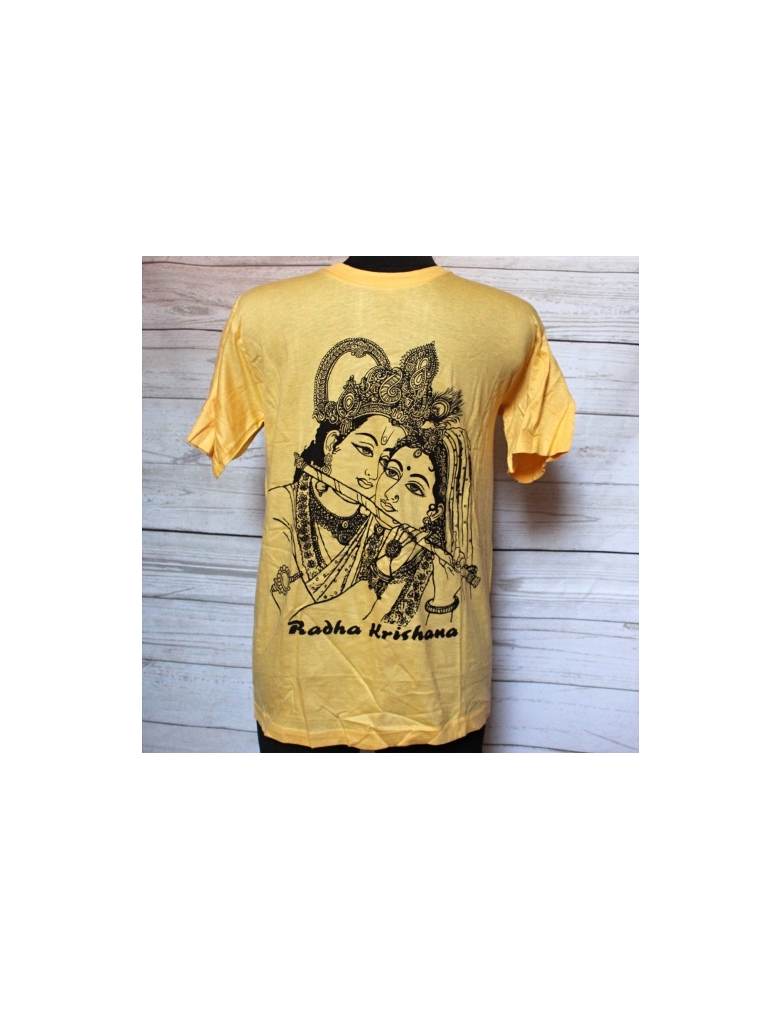 Tričko z měkké bavlny s motivem obličejů Rádky a Krishny v šedé barvě. Na zádech s nápisem.