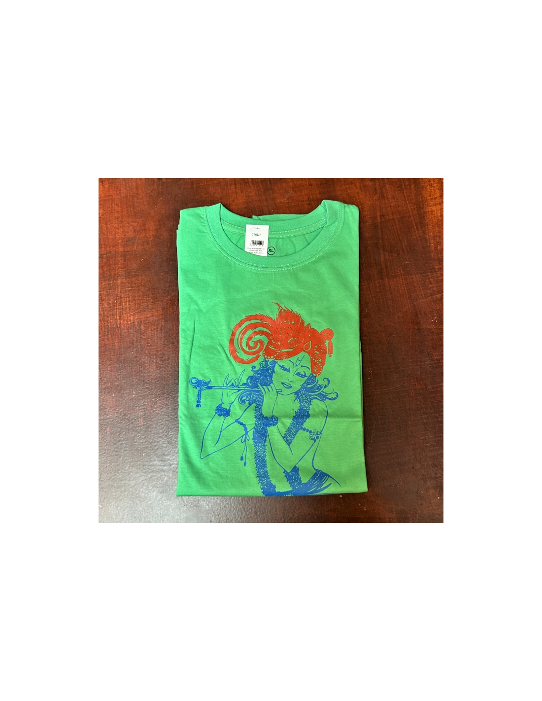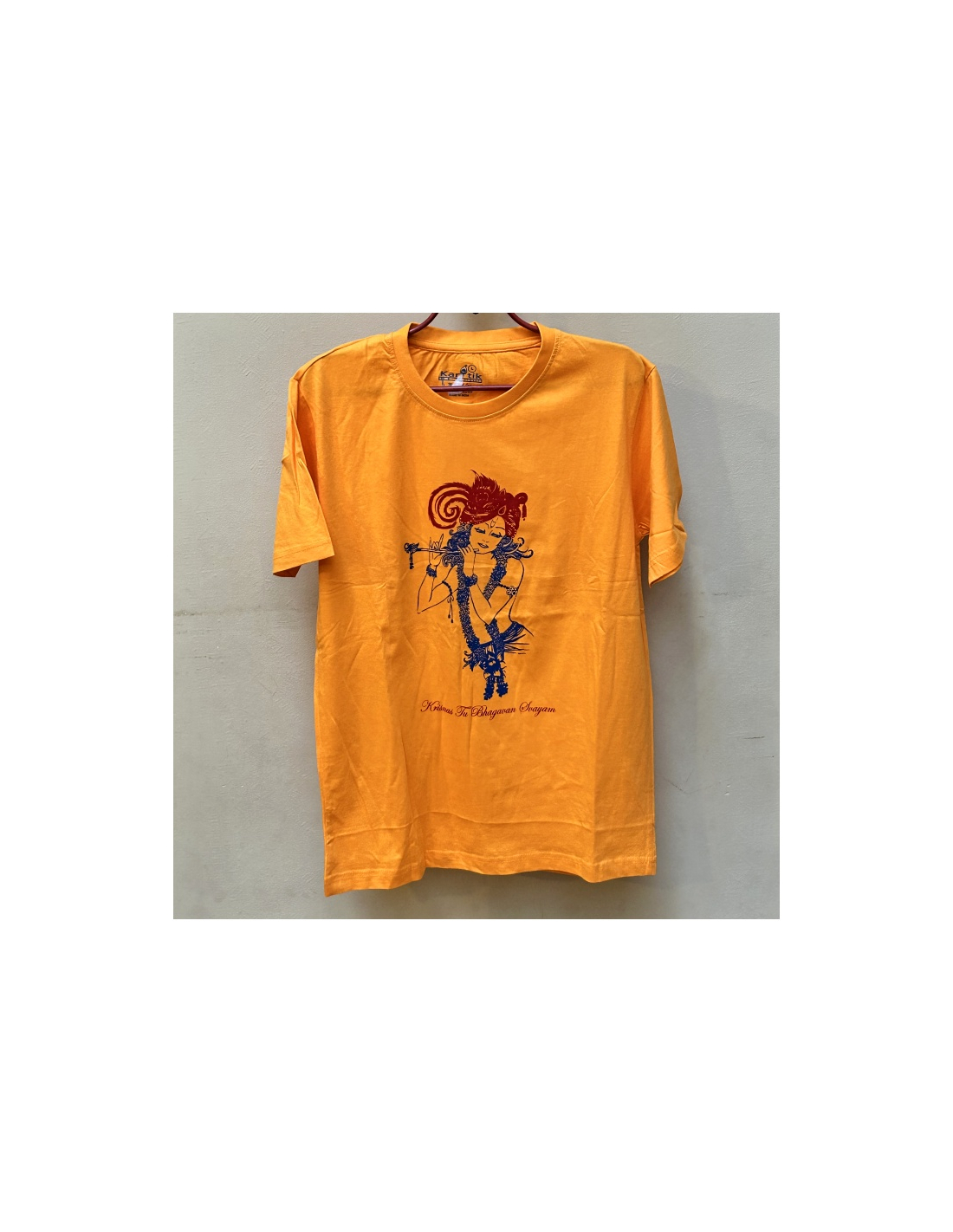 Bavlněné tričko s krátkým rukávem a nápisem Krisnas Tu Bhagavan Swayam. Zadní díl je bez potisku.