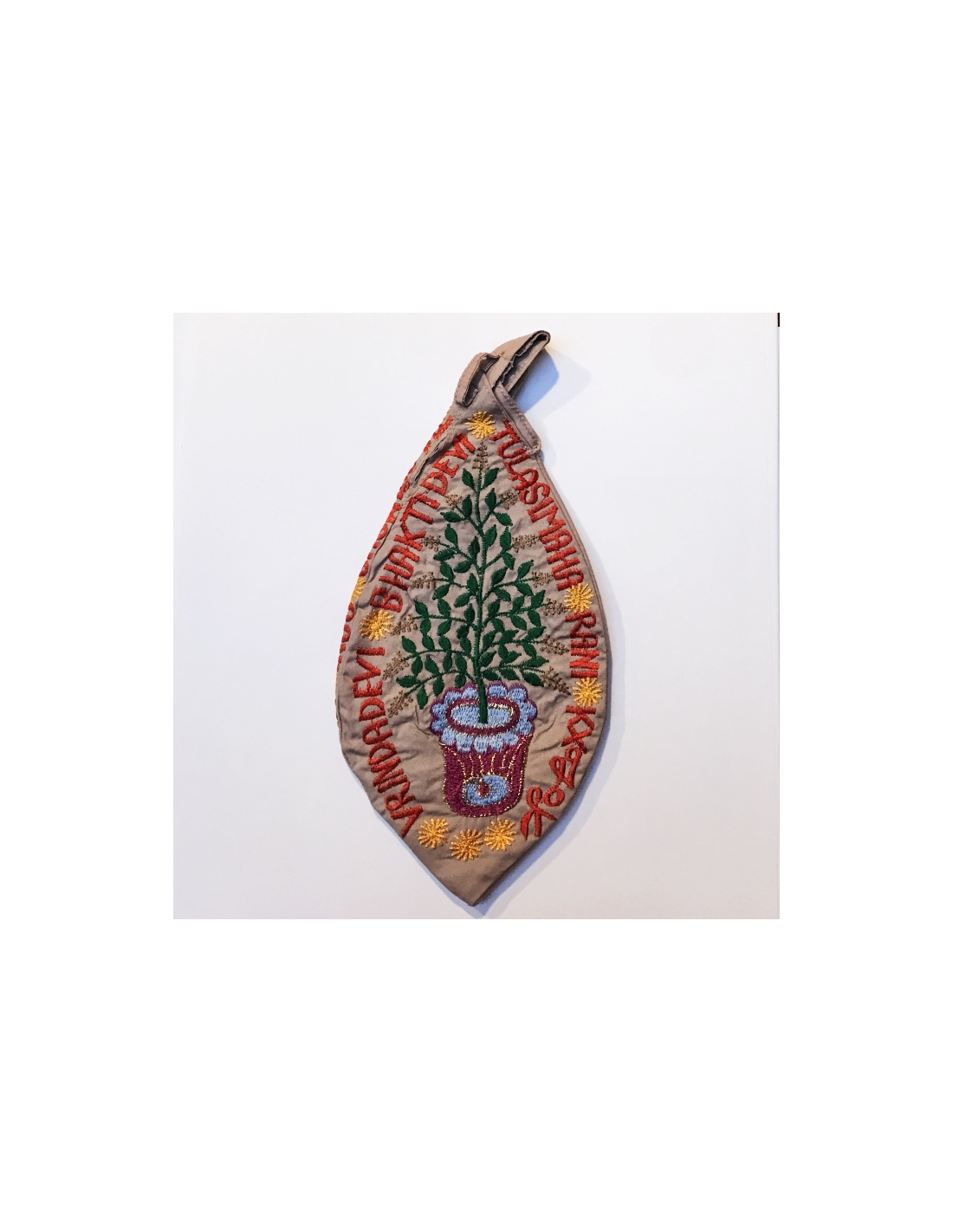 Bavlněný japa pytlík na růženec. Má kapsičku na zip. Z obou stran vyšívaný stejným vzorem se zobrazením tulasí.