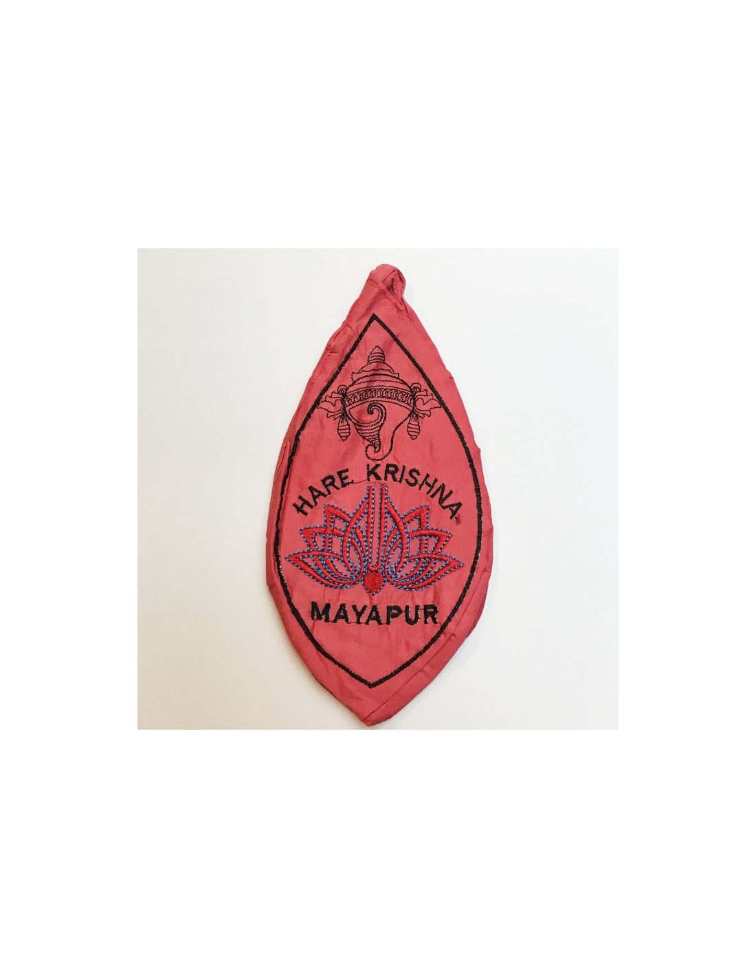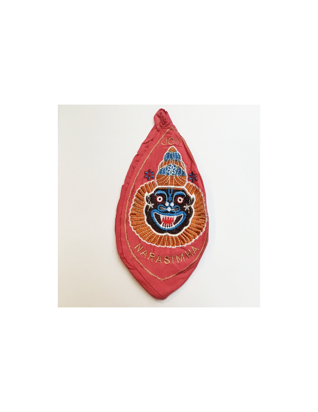 Bavlněný vyšívaný japa pytlík s Nrsimhadévou. Na zadní části je vyšito Hare Krišna Mayapur.